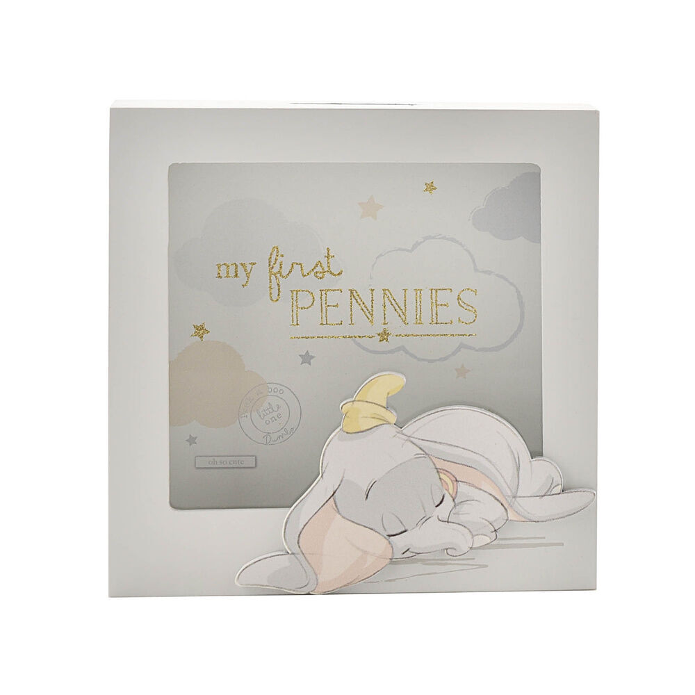 Deze prachtige spaarpot helpt ouders te sparen voor onverwachte uitgaven voor het nieuwe gezinslid. De houten spaarpot met venster heeft een grijze afwerking, aangevuld met een schattige tekening van een slapende Dumbo in kleurpotloden, en een muntgleuf aan de bovenkant. Op het verwijderbare achterpaneel staat de tekst "My First Pennies" in gouden glitterletters, tegen een achtergrond van pastelkleurige wolken en sterren.