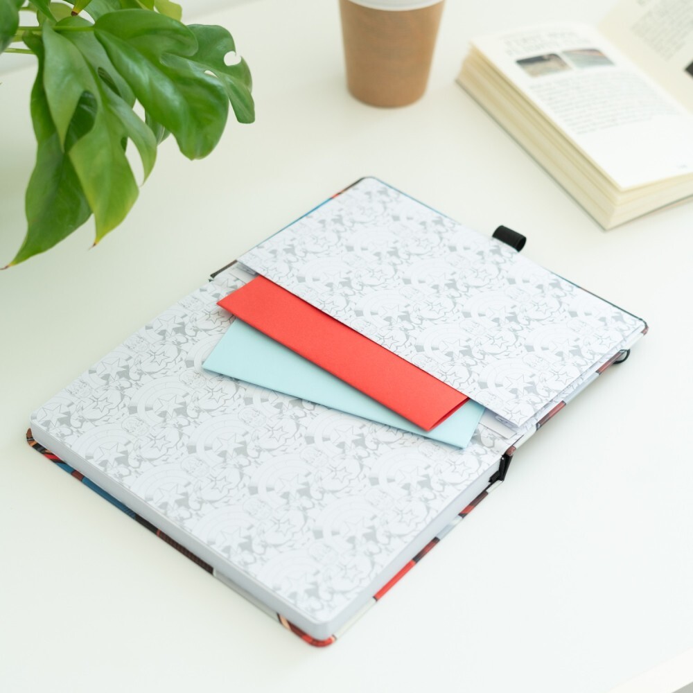 A5 notitieboek (14,8 x 21 cm) met pen. Het heeft een harde kaft met reliëfdetails en een zachte afwerking, afgeronde hoeken, een gelijmde binding, een speciaal ontworpen binnenwerk met kogels, een lintje als bladwijzer, een binnenvakje en een elastische sluiting. Het notitieboek bevat 96 vellen (192 pagina's) papier van 100 g/m². Inclusief pen en elastiekje.