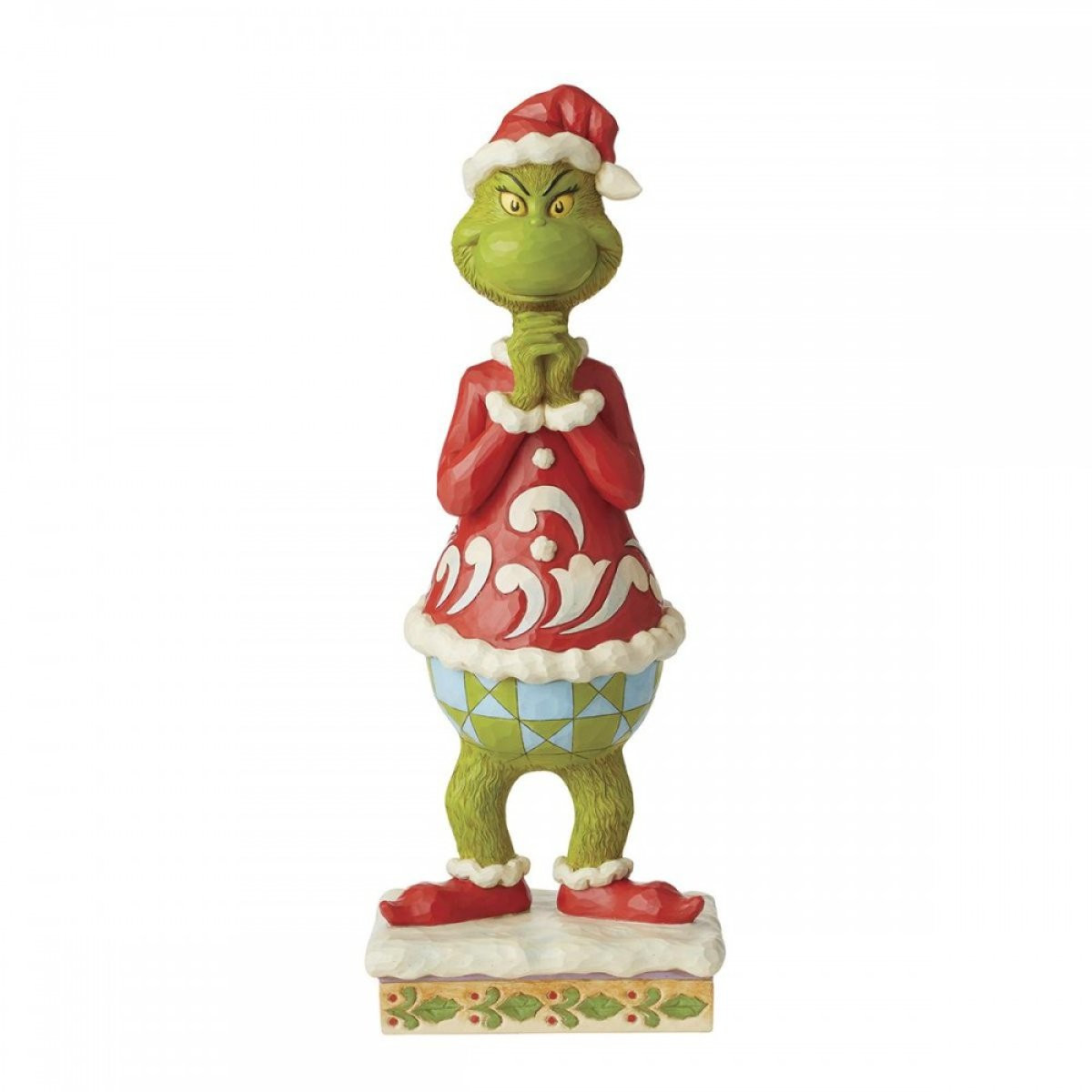 Grinch denkt met zijn handen onder zijn kin gevouwen over zijn plannen om Kerstmis te stelen. Jim Shore legt de kleurrijke persoonlijkheid van de Grinch vast in dit handgemaakte 20-inch beeld, terwijl hij zijn eigen onmiskenbare volkskunstontwerp toevoegt.