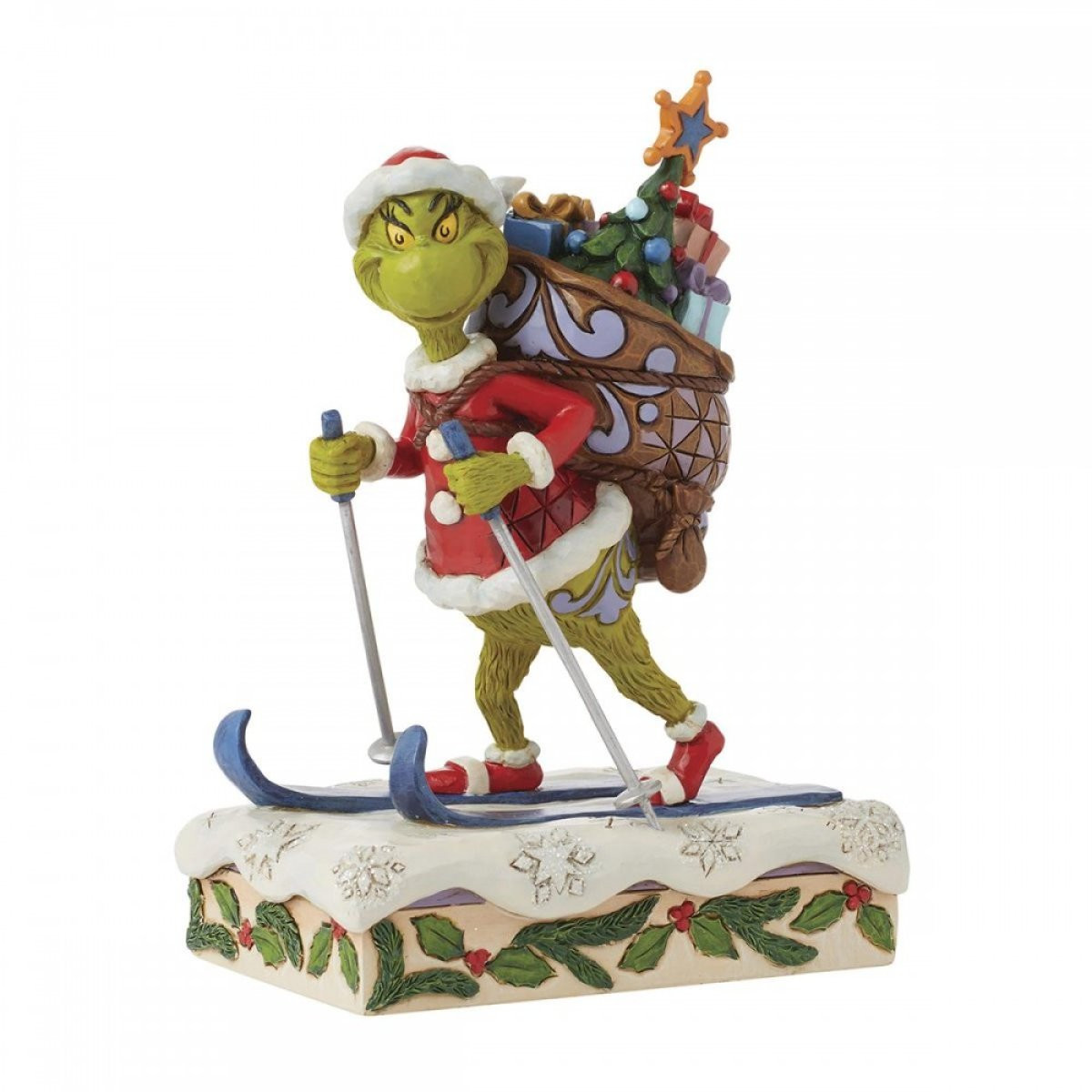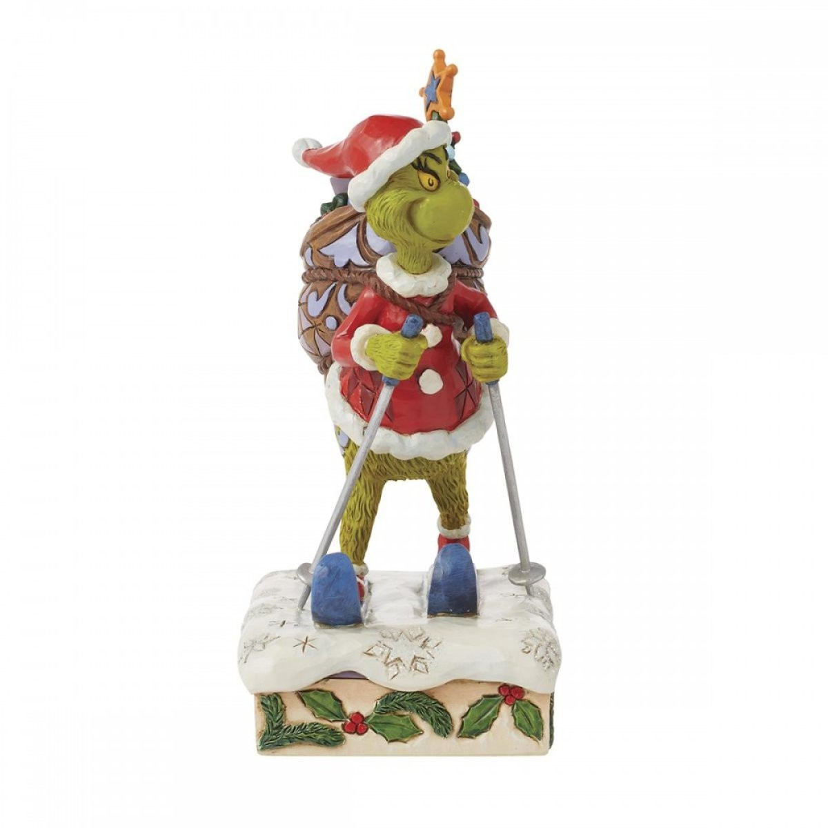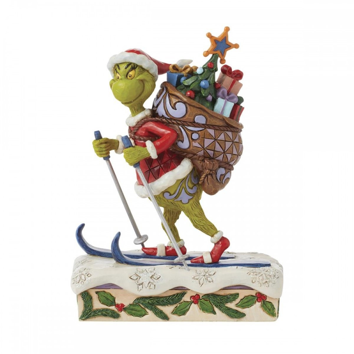 Dit beeldje toont de Grinch die door de besneeuwde bergen skiet met een zware zak met cadeautjes en een boom op zijn rug. Verkleed als Kerstman gaat hij deze cadeautjes niet bezorgen, maar heeft hij ze zojuist gestolen uit de huizen van elk kind in Chouville! Uit de Grinch-collectie, ontworpen door de bekroonde kunstenaar en beeldhouwer Jim Shore. Elk beeldje is met de hand geschilderd en er worden kleine kleurvariaties verwacht, waardoor elk stuk uniek is. Verpakt in een geschenkverpakking. Deze artikelen zijn geen kinderspeelgoed. Alleen bedoeld voor volwassenen.