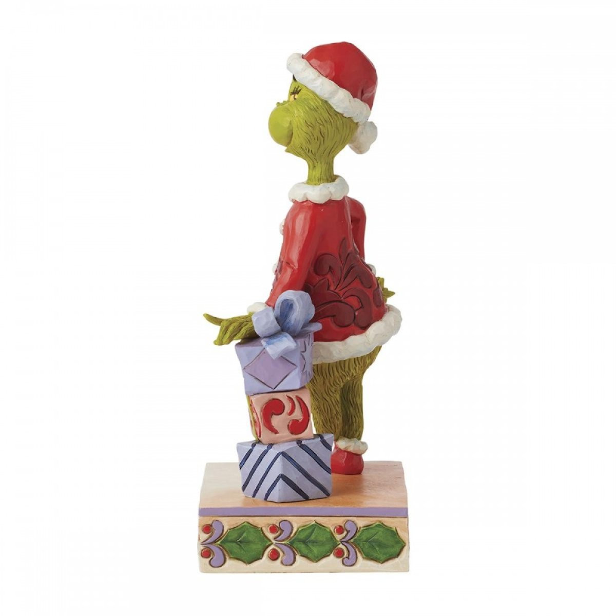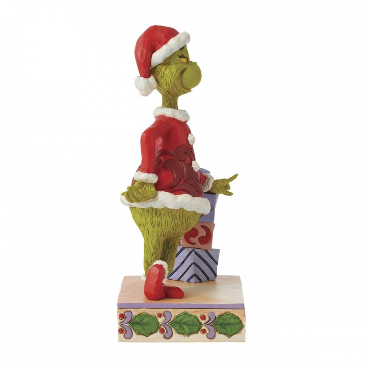 Op dit Jim Shore -beeldje is de Grinch afgebeeld, verkleed als kerstman, leunend tegen een stapel prachtig ingepakte cadeautjes. Met gekruiste benen staat de Grinch met houding en één hand op zijn heup. Zal hij Kerstmis stelen of van het seizoen leren houden? Uit de Grinch-collectie, ontworpen door de bekroonde kunstenaar en beeldhouwer Jim Shore. Elk beeldje is met de hand geschilderd en er worden kleine kleurvariaties verwacht, waardoor elk stuk uniek is. Verpakt in een geschenkverpakking. Deze artikelen zijn geen kinderspeelgoed. Alleen bedoeld voor volwassenen.