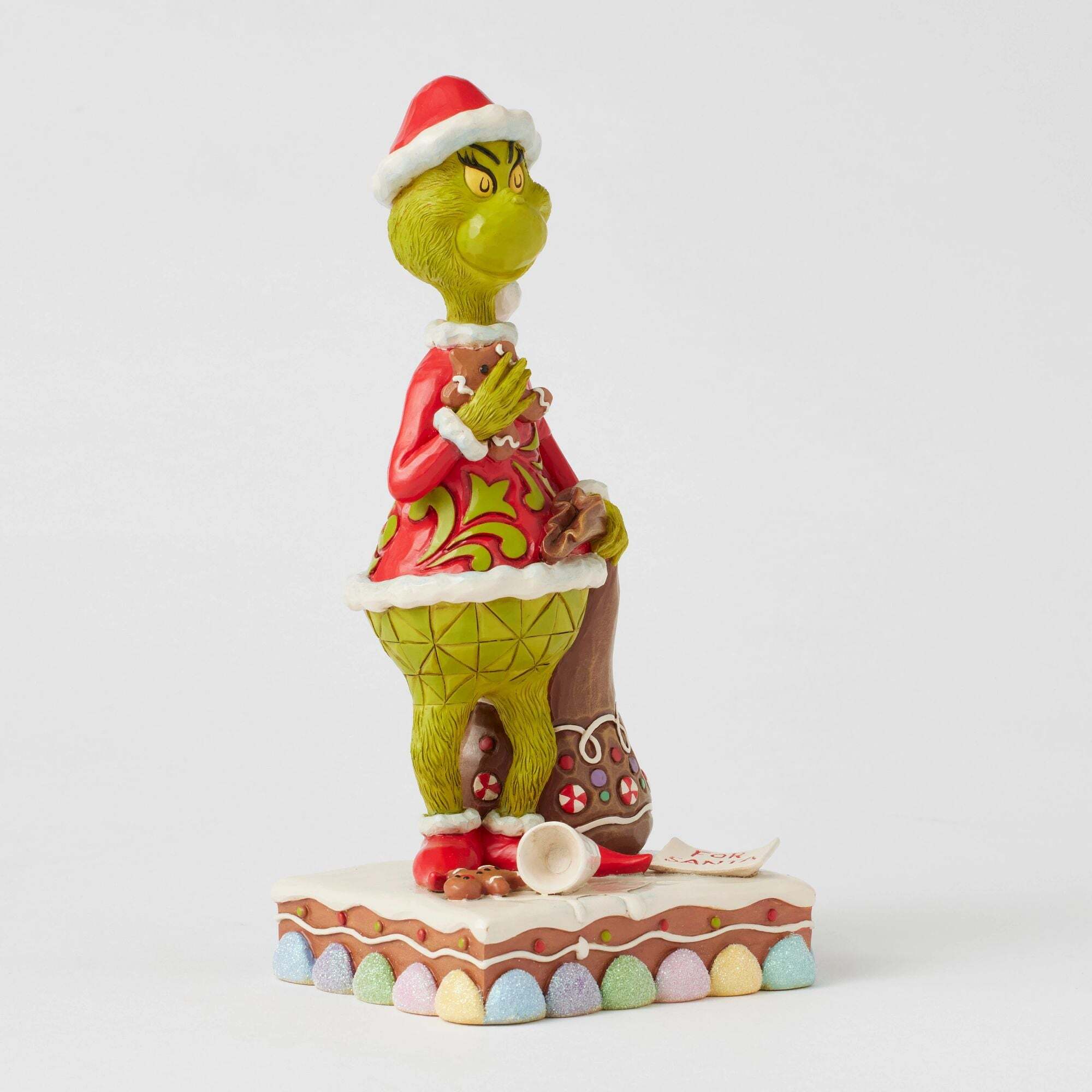 Verkleed als de Kerstmis , met zijn zak klaar om cadeautjes te stelen, smult de Grinch van peperkoek en morst hij kerstmelk. Met zijn complexe details en kenmerkende Jim Shore -ontwerpen legt dit beeldje de ondeugende geest van de Grinch perfect vast. Ontworpen door de bekroonde kunstenaar en beeldhouwer Jim Shore voor The Grinch Collection. Deze beeldjes zijn geen kinderspeelgoed. Alleen bedoeld voor volwassenen. Hoogte: 20,5 cm