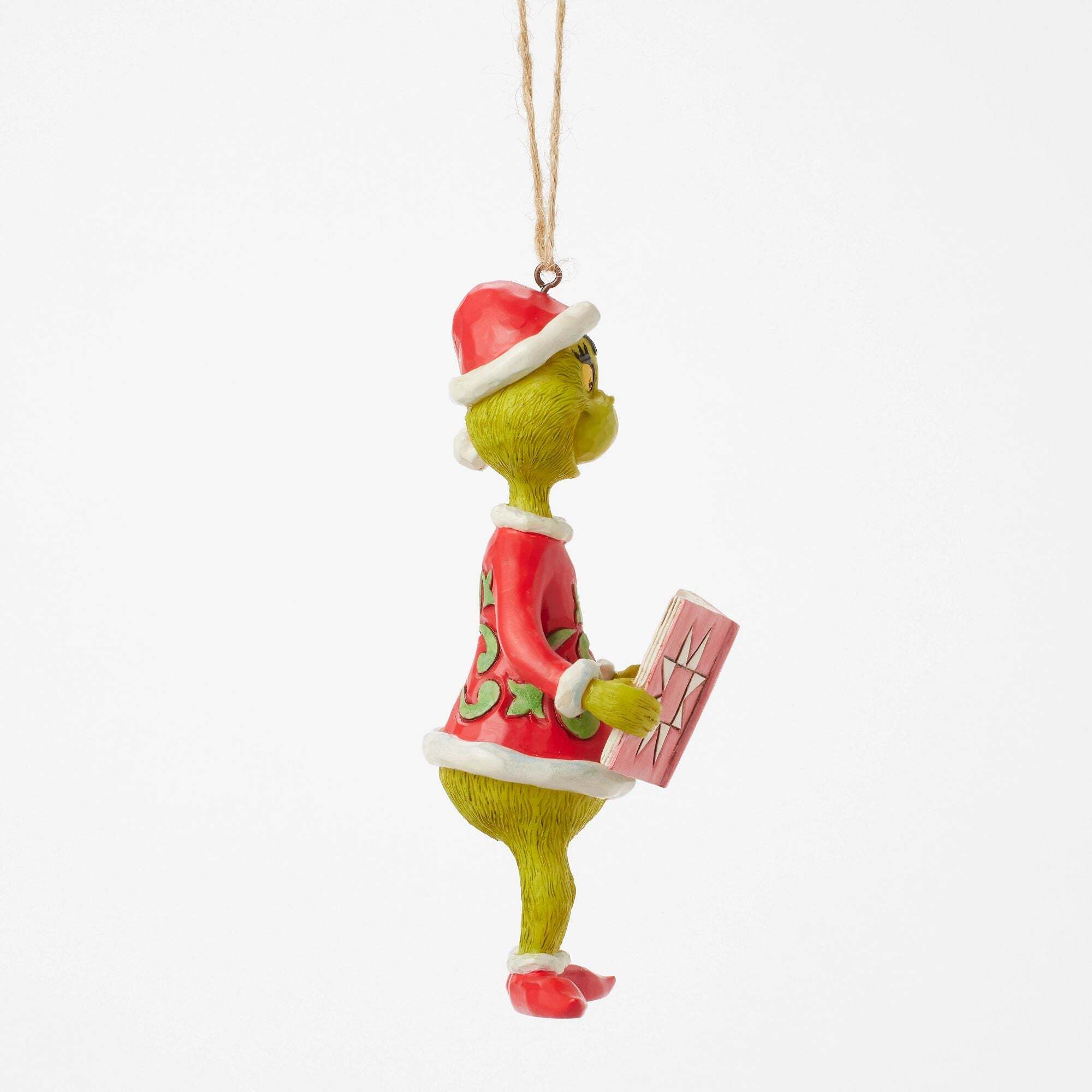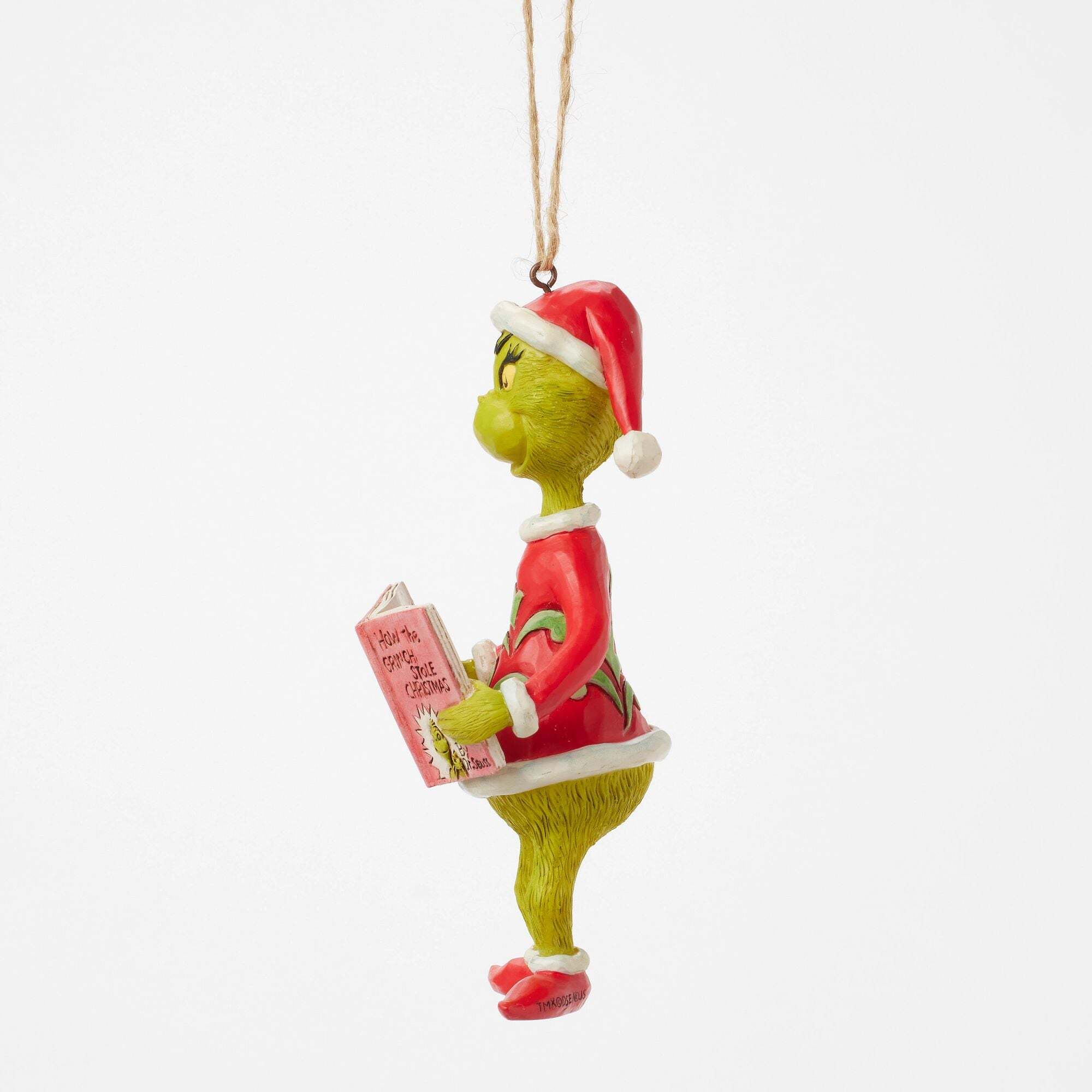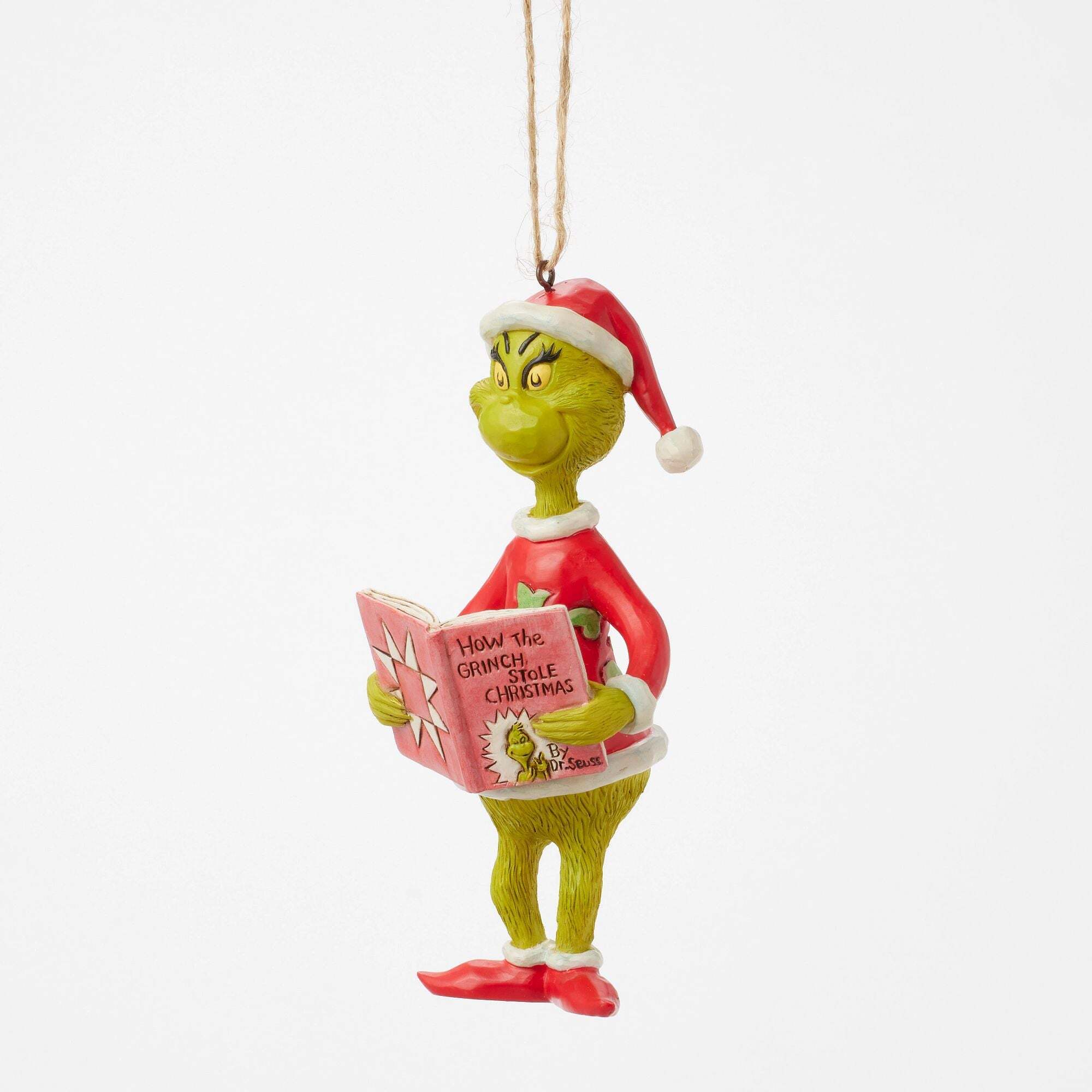 De Grinch, gekleed in een Kerstmis , leest aandachtig voor uit een exemplaar van Dr. Seuss' "How the Grinch Stole Kerstmis". Dit hangende ornament van Jim Shore legt deze charmante scène vast, terwijl de Grinch zich verdiept in zijn eigen verhaal. Ontworpen door de bekroonde kunstenaar en beeldhouwer Jim Shore voor The Grinch Collection. Deze beeldjes zijn geen kinderspeelgoed. Alleen bedoeld voor gebruik door volwassenen. Hoogte: 13,5 cm