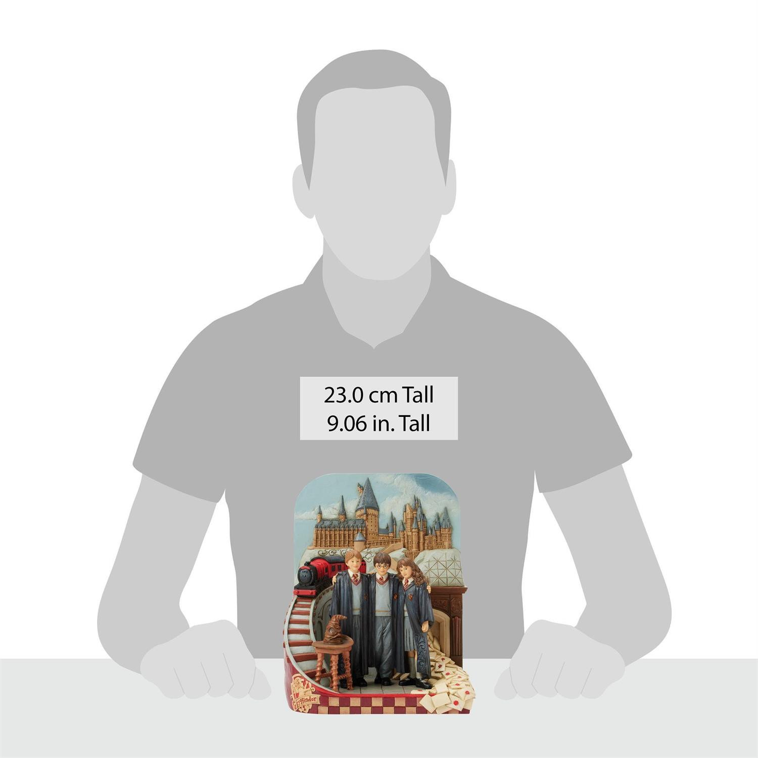 Deze betoverende Jim Shore scène brengt de magie van Zweinstein tot leven met Harry, Ron en Hermelien die samen in hun Gryffindor -gewaden buiten het iconische kasteel staan. Het ontwerp omvat de Zweinsteinexpress, vliegende brieven en de Sorteerhoed.