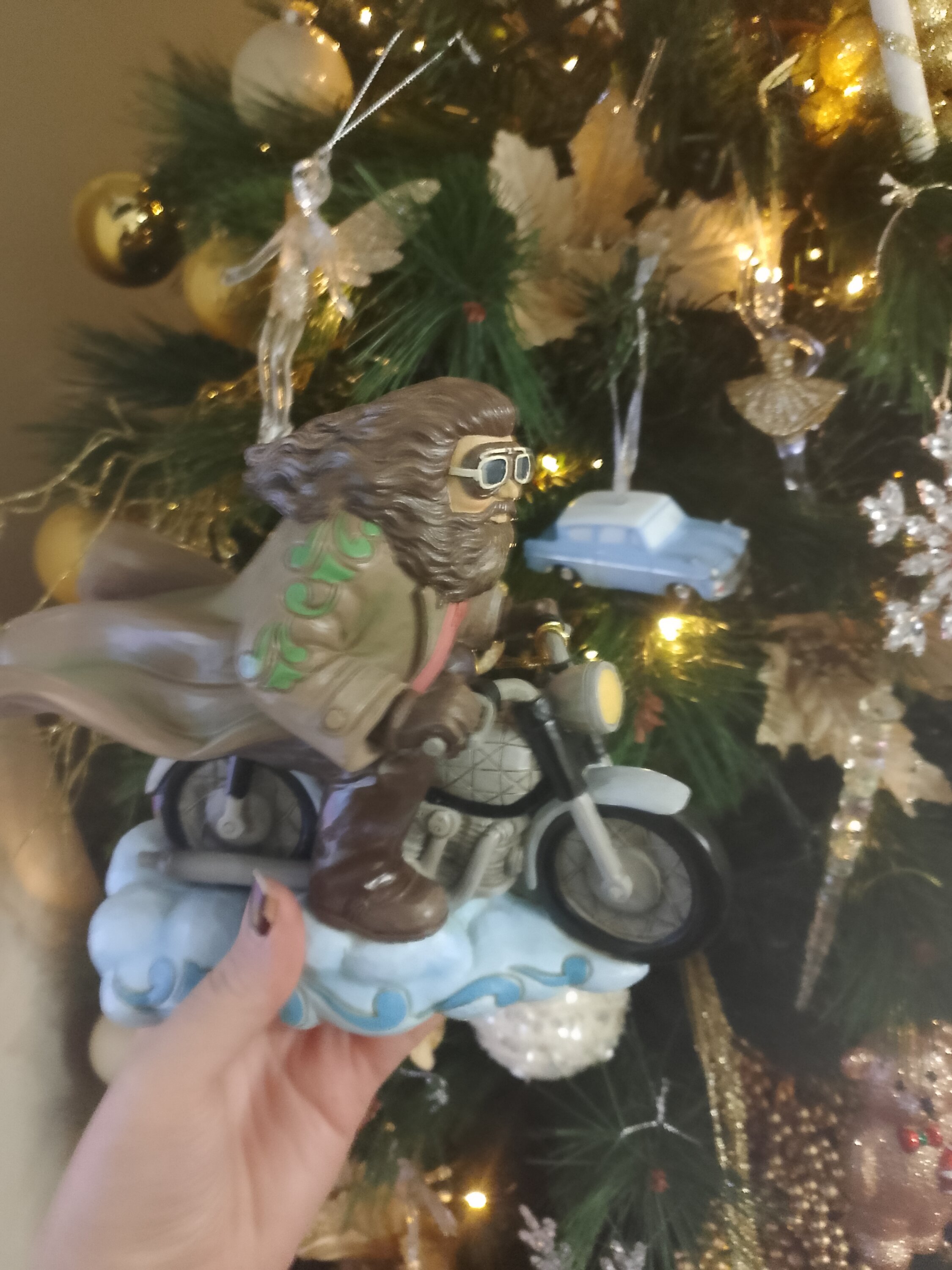 Ervaar de spanning van vliegen met deze Jim Shore scène met Hagrid die op zijn iconische vliegende motorfiets rijdt. Met zijn lange jas wappert en zijn bril stevig op zijn plaats, snelt Hagrid door de lucht en legt de opwinding van de wizarding world vast.