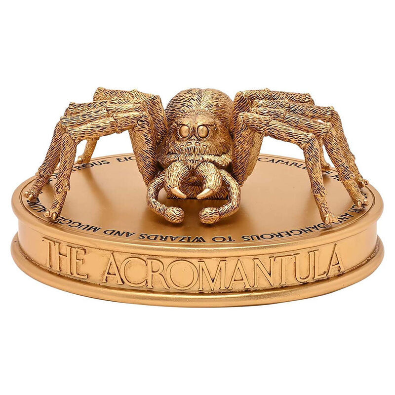 - Dit Aragog beeldje is gedetailleerd afgewerkt in een gouden tint en staat op een voetstuk met de inscriptie "De Acromantula".