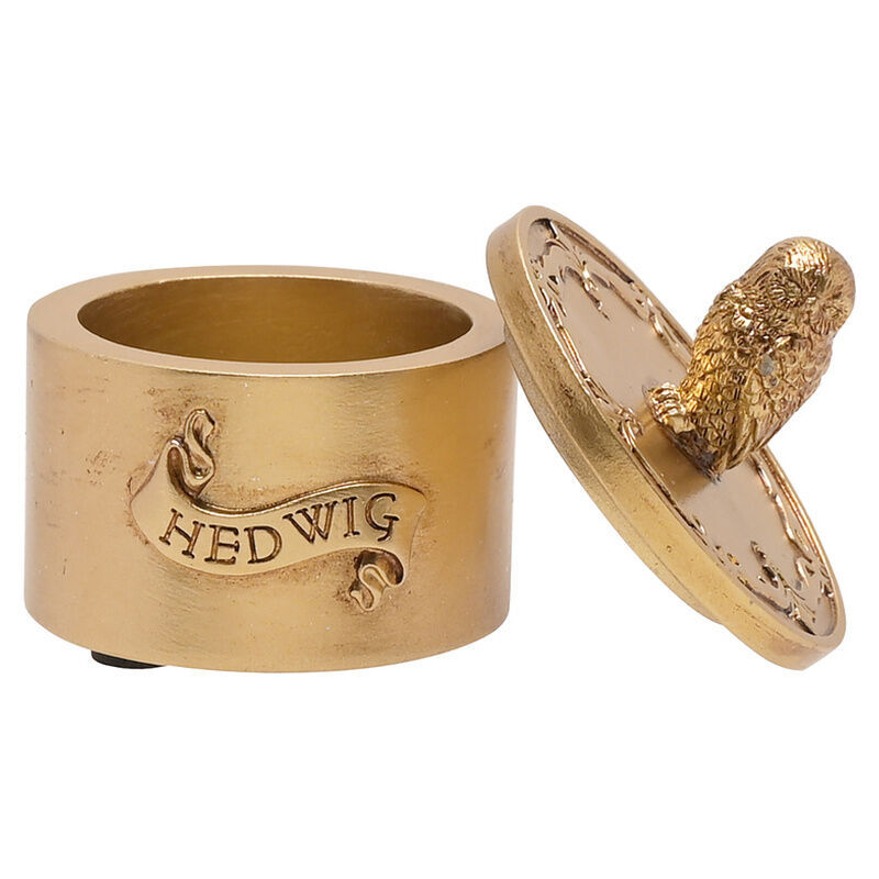 Het decoratieve sieradendoosje van hars heeft een gouden, metallic afwerking, compleet met een reliëf ' Hedwig'-banner en een 3D-vorm op het deksel. Het doosje is ontworpen voor het veilig opbergen van kleine, waardevolle voorwerpen.