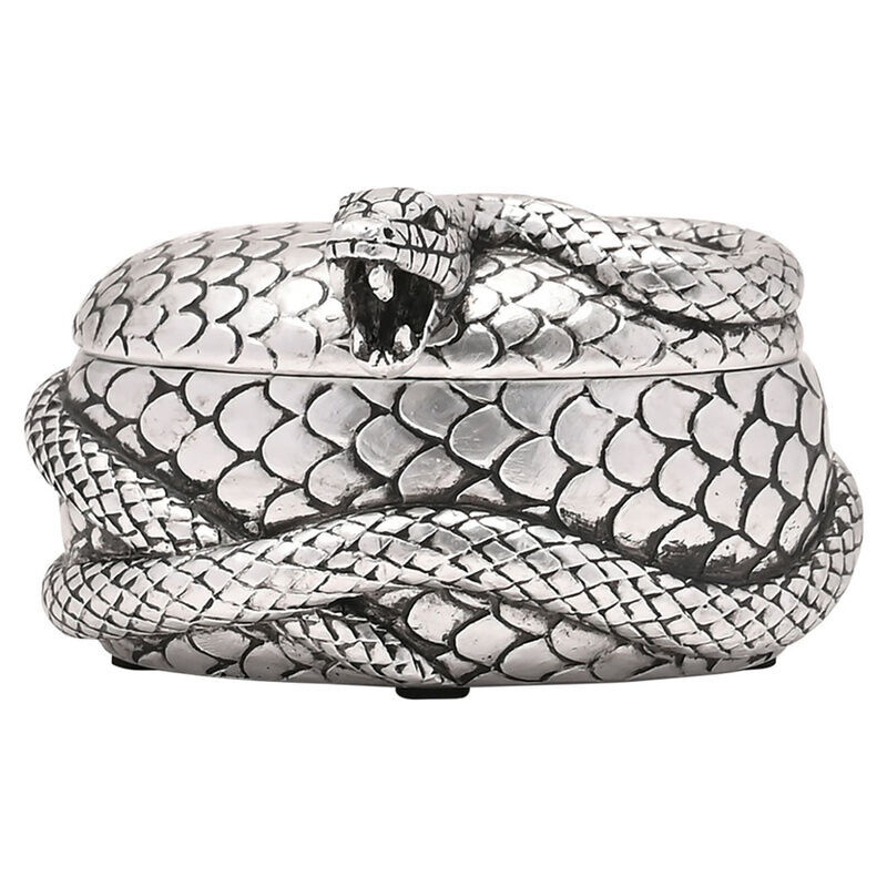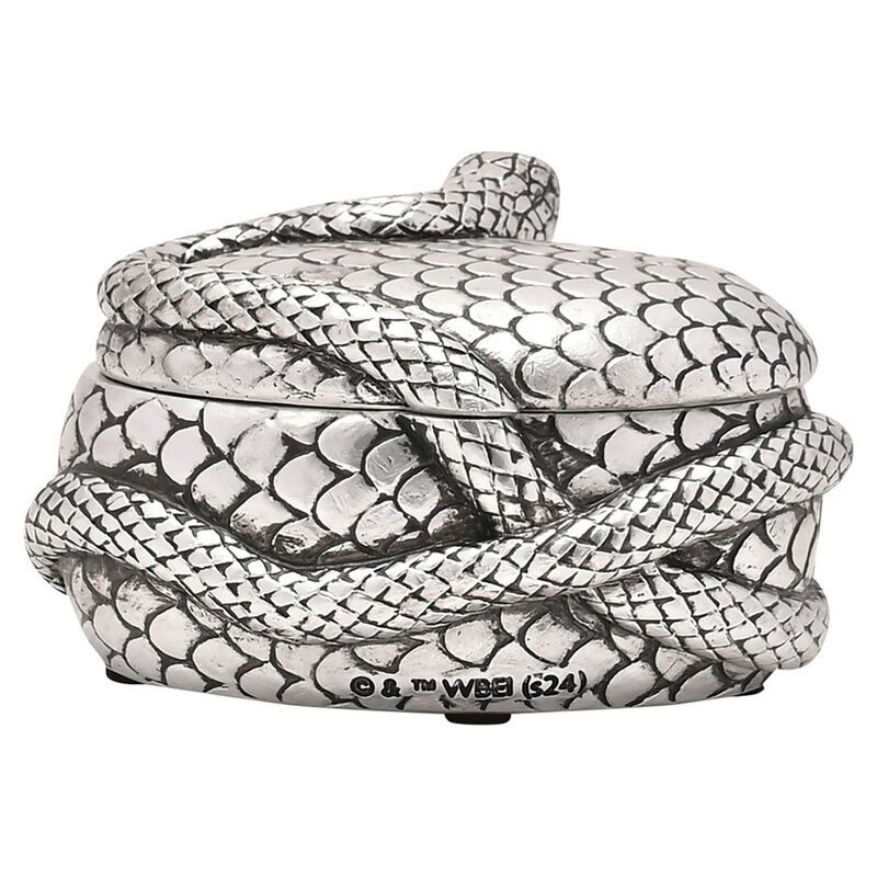 Het ontwerp toont Nagini, de geduchte slang van Heer Voldemort, elegant gewikkeld rond de zilverkleurige sieradendoos.