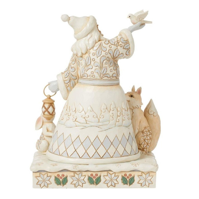 De kerstman brengt veel tijd door op de Noordpool, terwijl hij door het omliggende White Woodland -bos wandelt. Deze prachtige kerstman van Jim Shore deelt een scène van de kerstman omringd door zijn harige en gevederde vrienden. Hij draagt een witte mantel met opdruk en een glimlach.