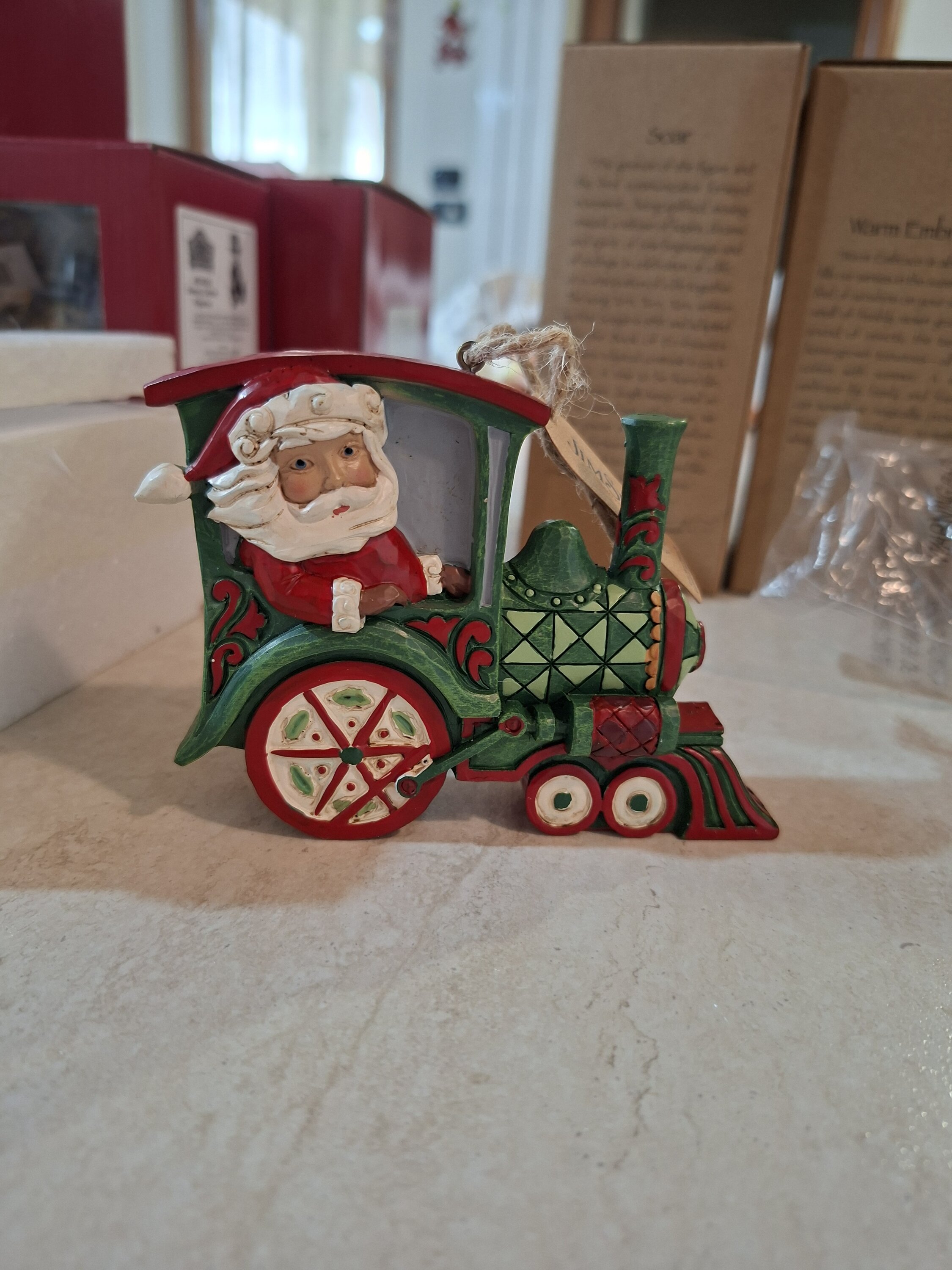 Allemaal aan boord van de Kerstmis , volgende halte, vakantieherinneringen! De Kerstman bestuurt deze fantastische rood-groene rosemaling-locomotief met maretak-aangedreven wielen. Hang deze stijlvolle trein in uw boom en bewonder het creatieve vakmanschap van Jim Shore.