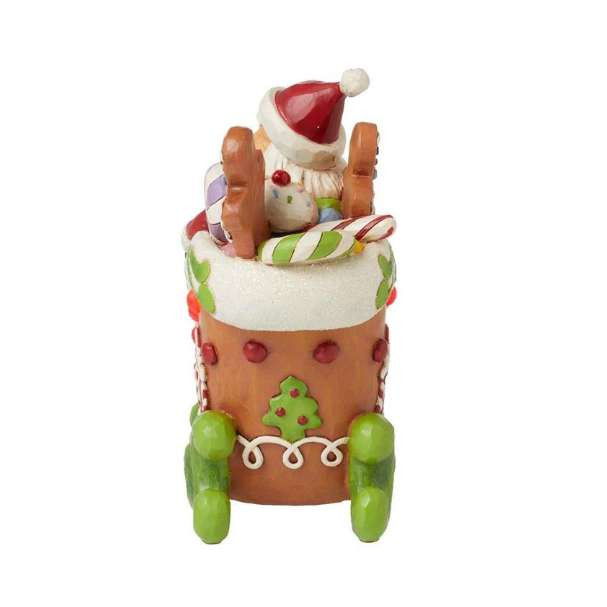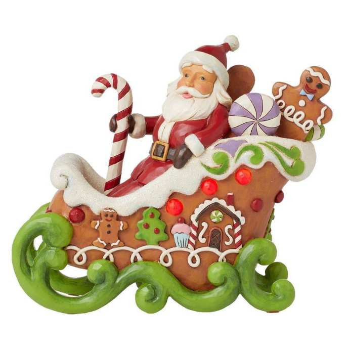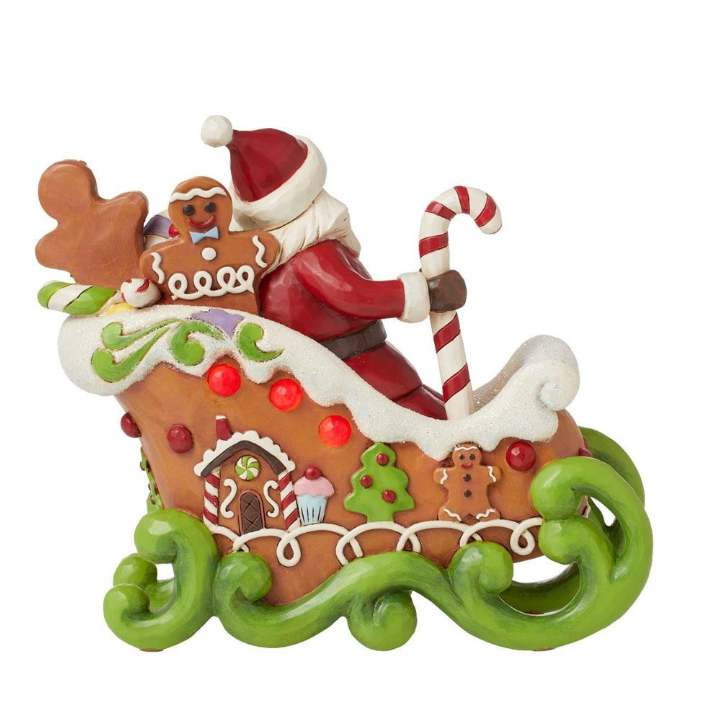 Deze Jim Shore Gingerbread Kerstmis is zo zoet als een koekje! De Kerstman zit in een slee van peperkoekkoekjes en lacht vrolijk omringd door snoep. Met een zuurstokstaf en geschilderde glazuurscène is deze LED-verlichte slee een feestelijke decoratietraktatie!