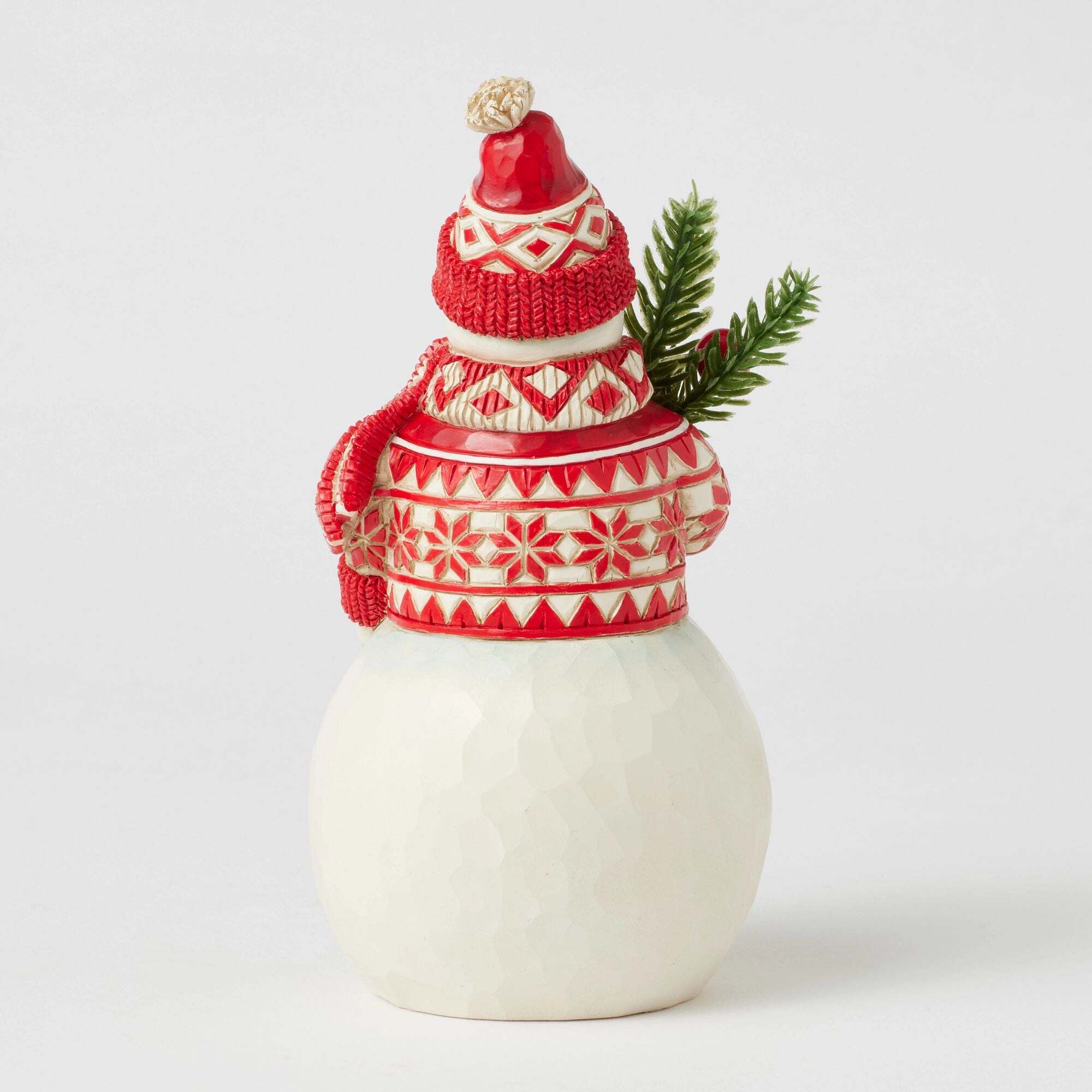Deze giechel Noorse sneeuwpop is gekleed in een trui, sjaal en muts en straalt die feestelijke Kerstmis uit. Met een brede glimlach houdt hij een verse dennentak en een dennenappel in zijn handen.