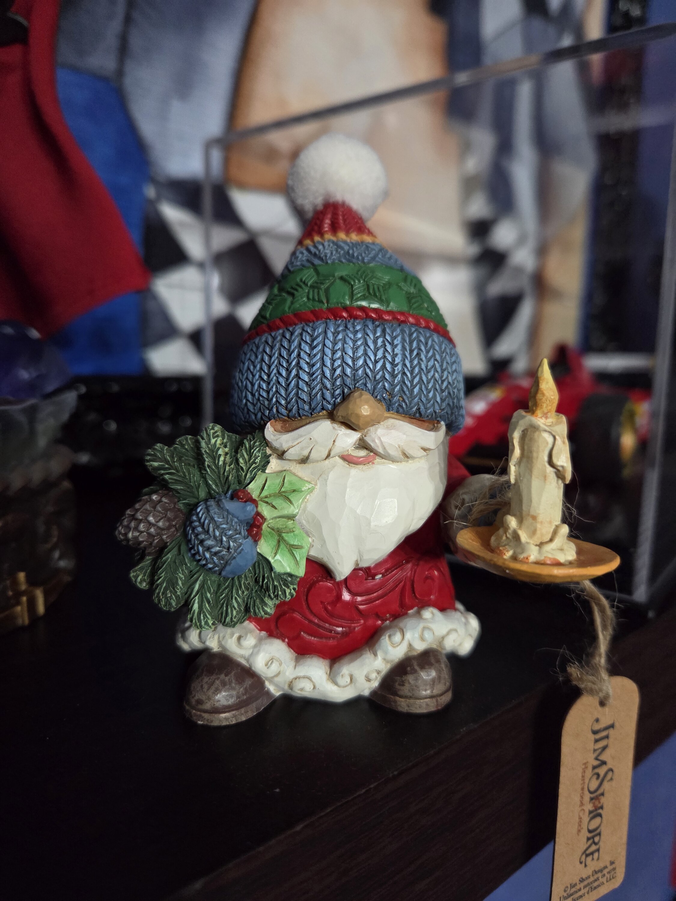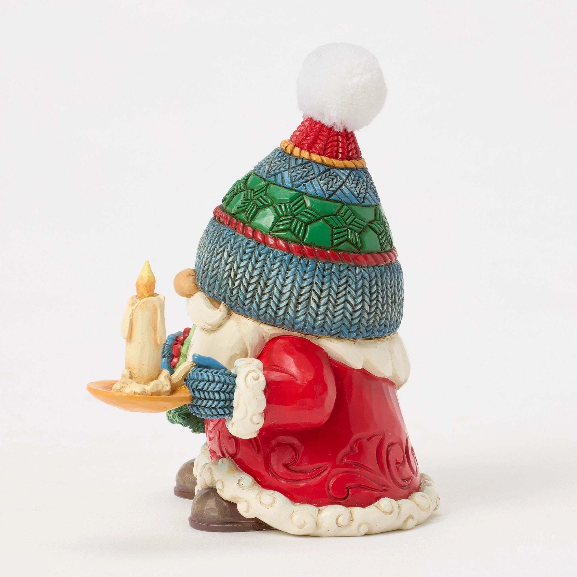 Deze feestelijke Jim Shore kabouter brengt de warmte van de feestdagen met een brandende kaars in zijn hand en zijn hoed over zijn ogen. Gekleed in een jas met bloemenmotief en een hoed met textuur, houdt hij een krans in zijn hand, klaar om de plek met vreugde te versieren.