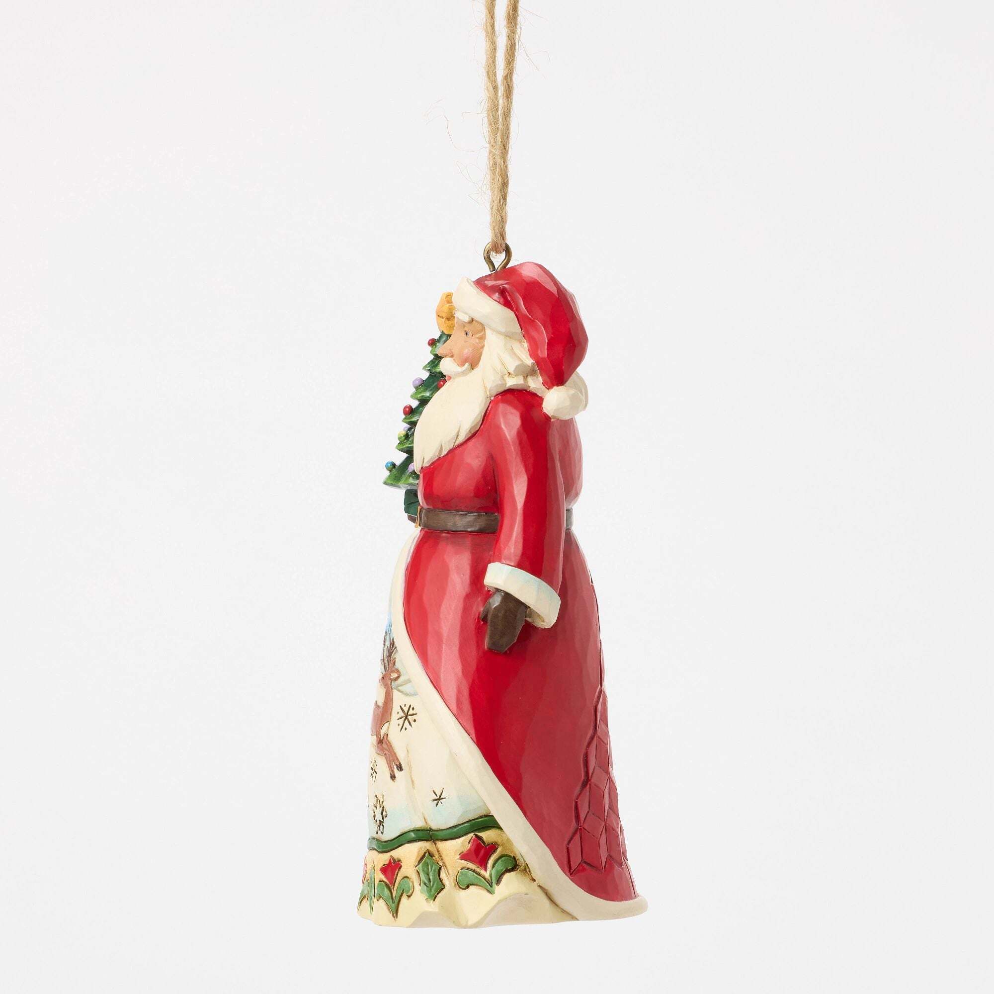 Deze elegante Kerstmis van Jim Shore toont Kerstmis met een kleine dennenboom, klaar om de magie van de feestdagen te brengen. Zijn cape opent en onthult een wintertafereel met een speels rendier dat in de sneeuw speelt.