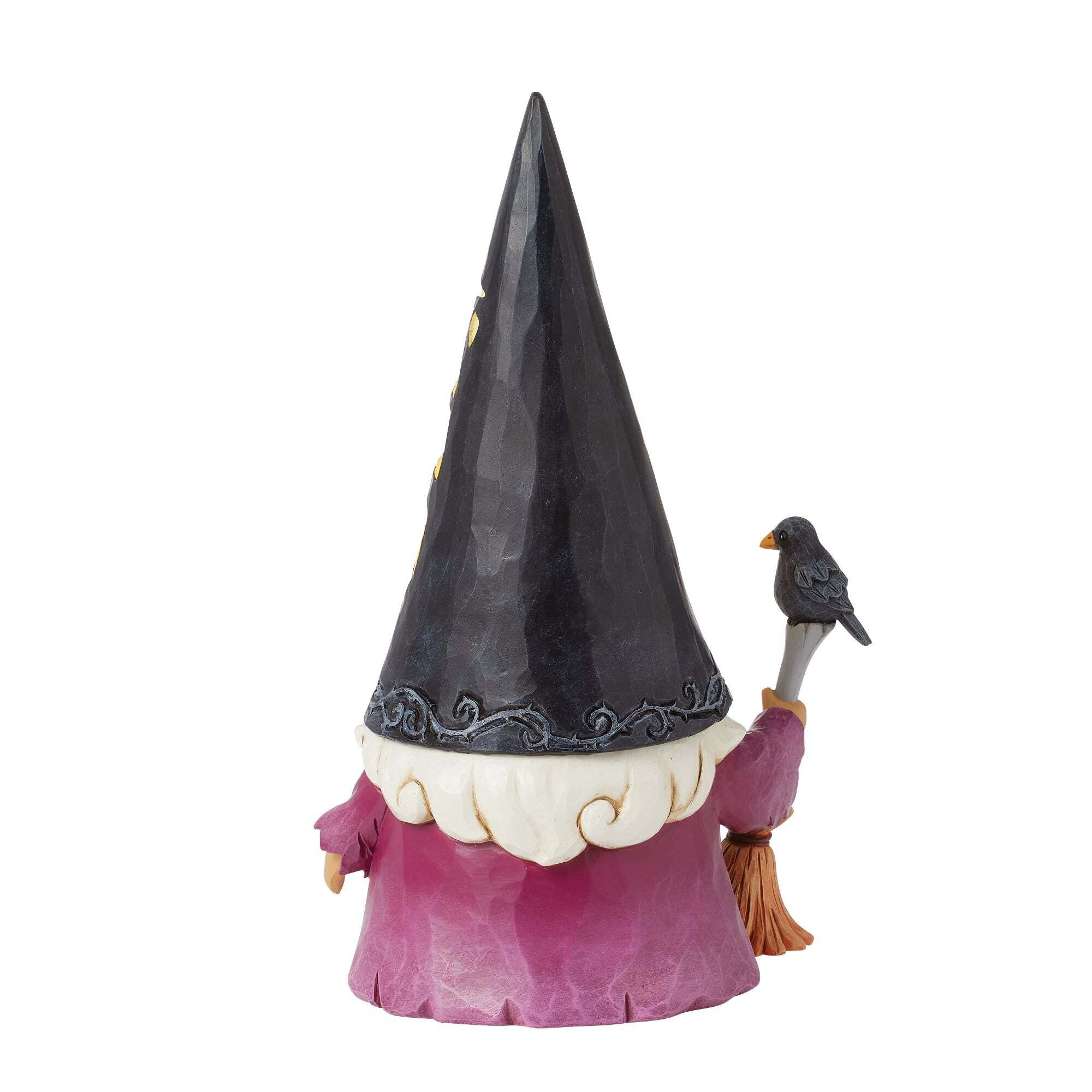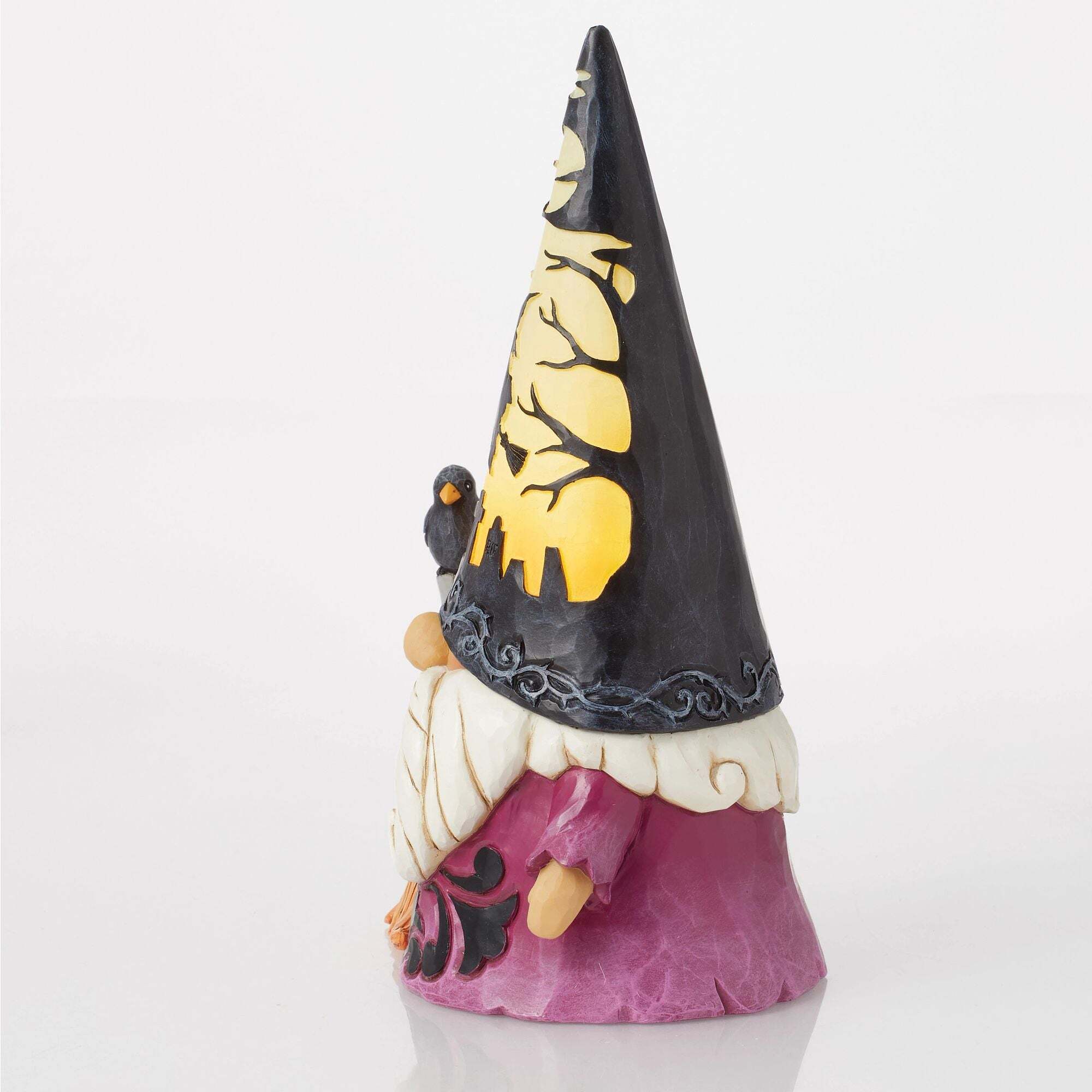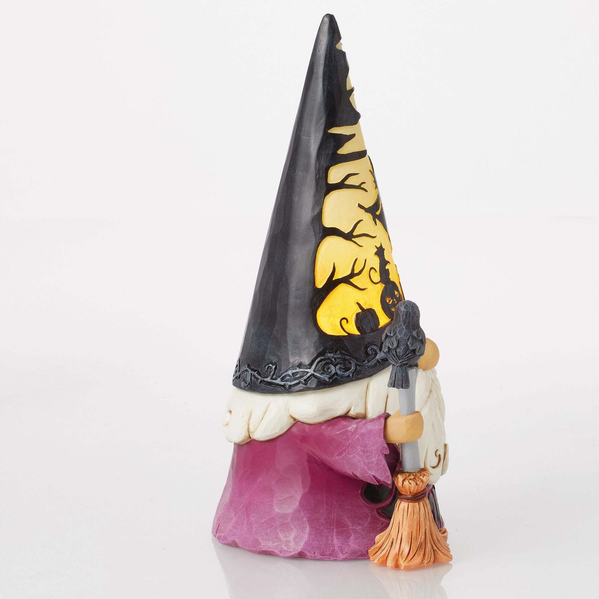 Laat je betoveren door de geest van Halloween met dit prachtige beeldje van een heksenkabouter, gesigneerd door Jim Shore. Achter zijn hoed schuilt een verlicht kerkhof, waar een heks de nacht in lijkt te vliegen voor een magisch schouwspel.