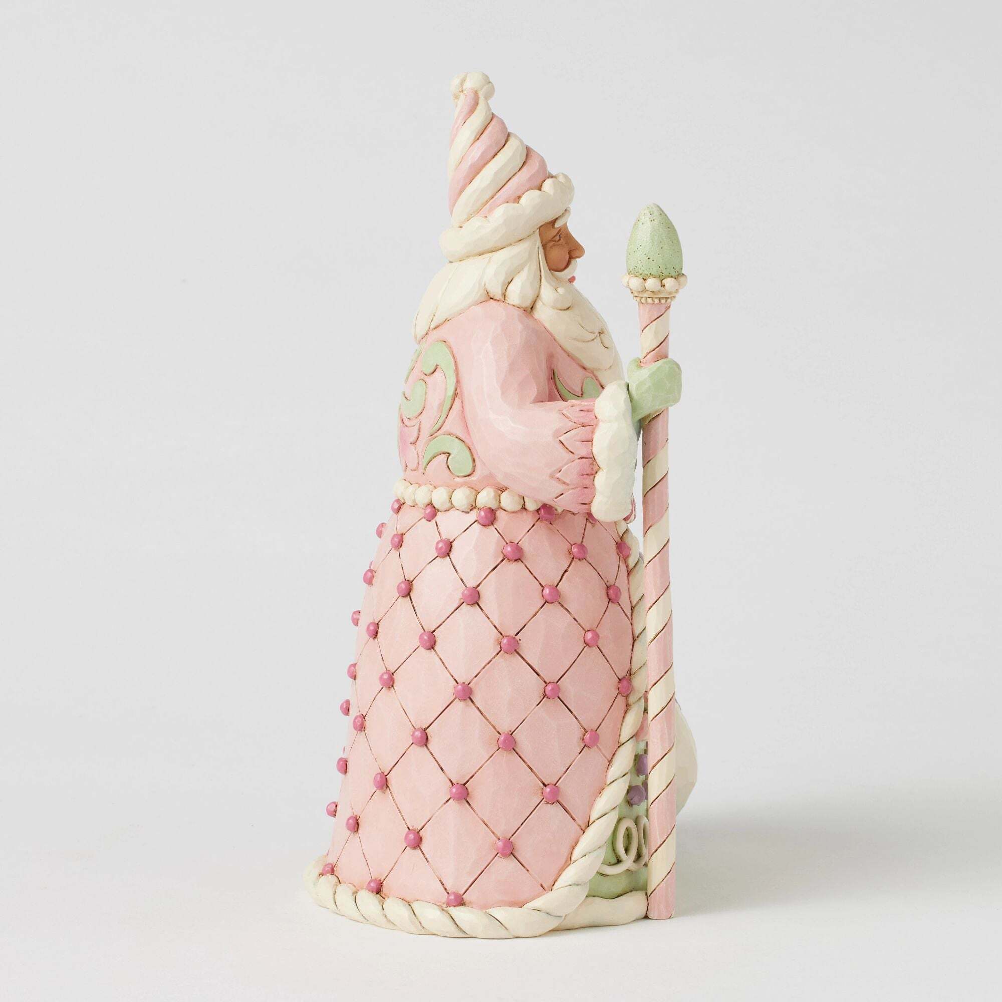 Dit charmante Kerstmis uit de Heartwood Sweets-collectie, gemaakt door Jim Shore, heeft mooie pasteltinten roze en groen en is versierd met snoep. Met een zuurstok en een zak lekkers in zijn handen lijkt zijn hoed op een draaiend ijsje, terwijl zijn cape is voorzien van de ontwerpen van de kunstenaar.