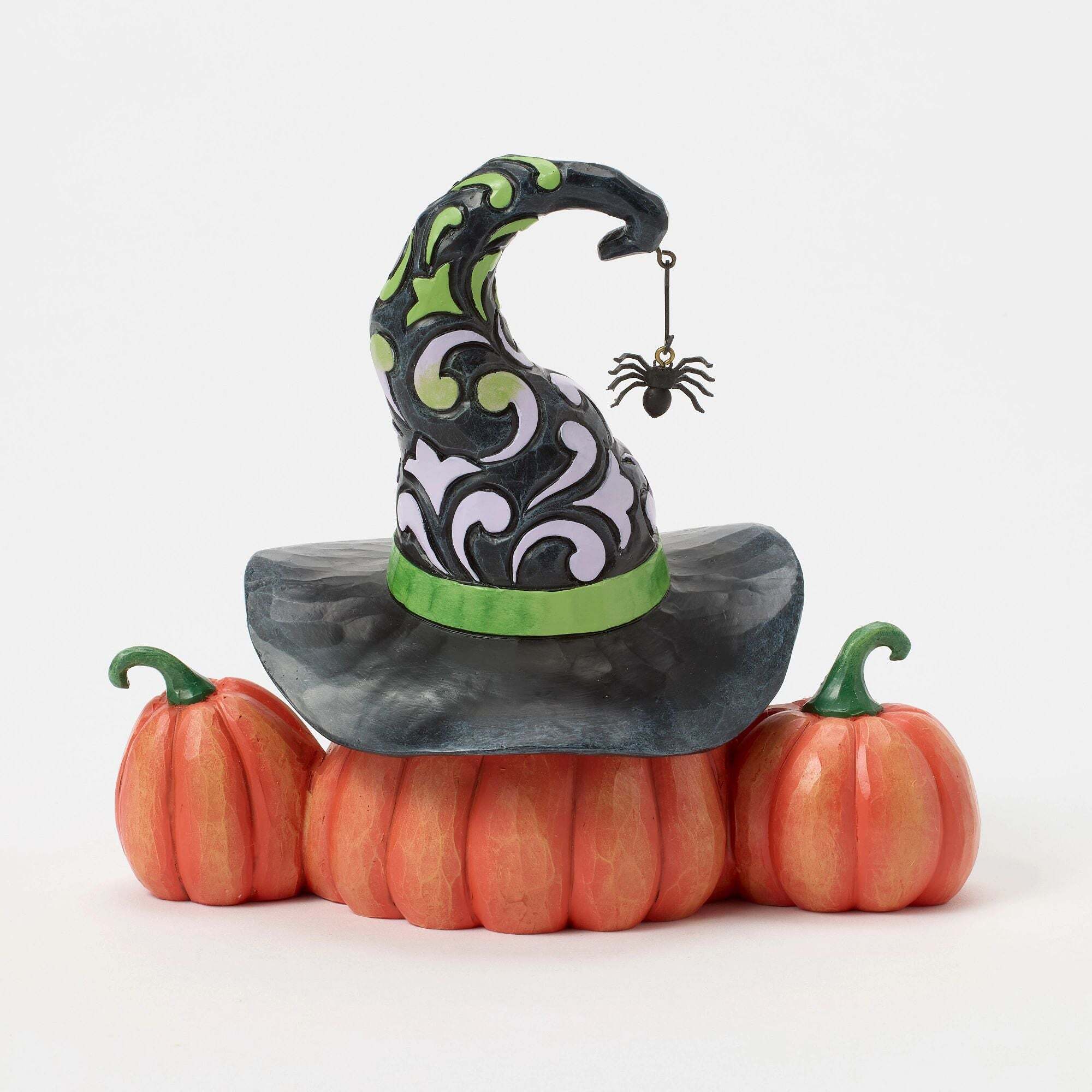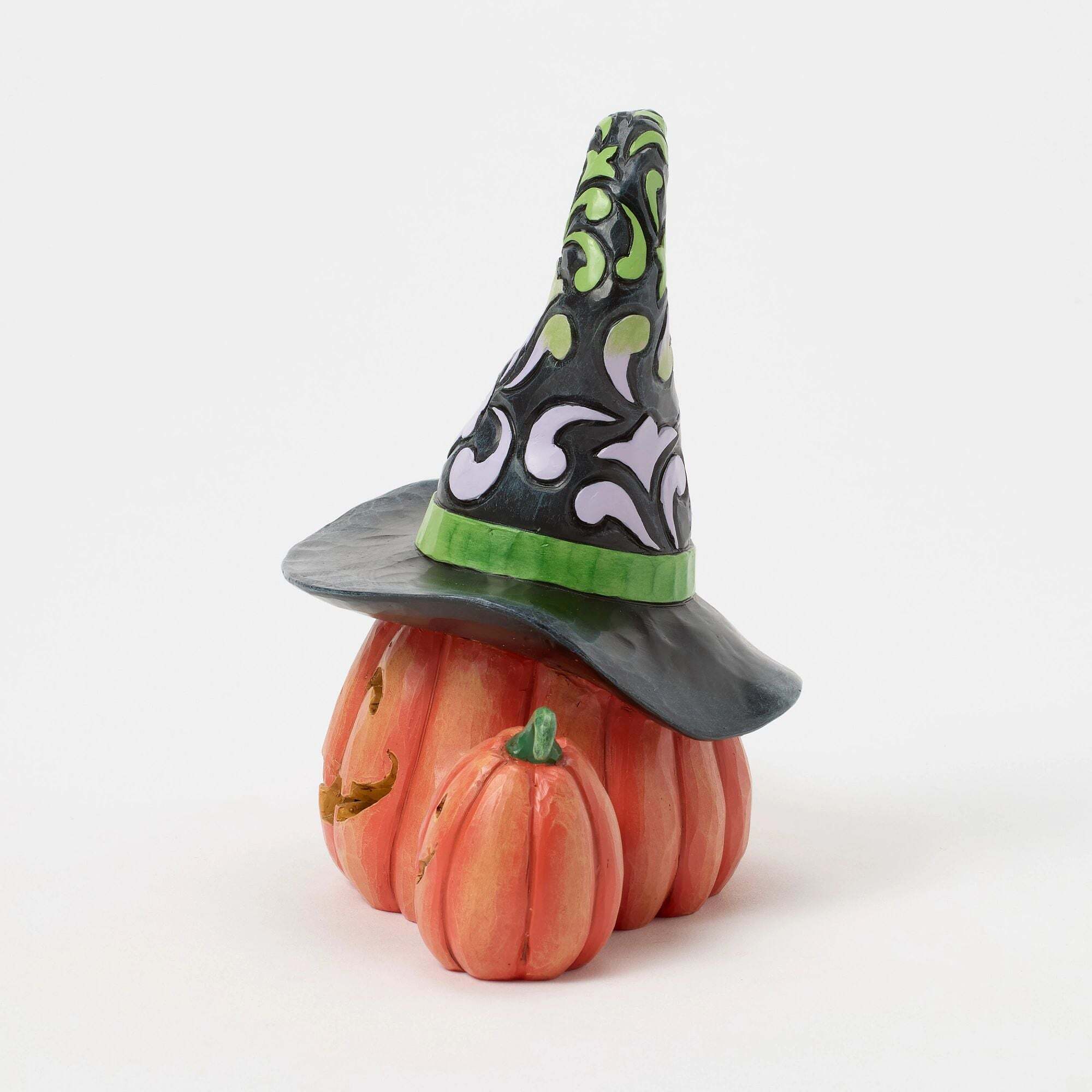 Kom in de Halloween met deze charmante beeldjes van Jim Shore, met drie lachende pompoenen. De grootste, in het midden, draagt een oplichtende heksenhoed ! Dit trio creëert een feestelijke maar toch mysterieuze sfeer.