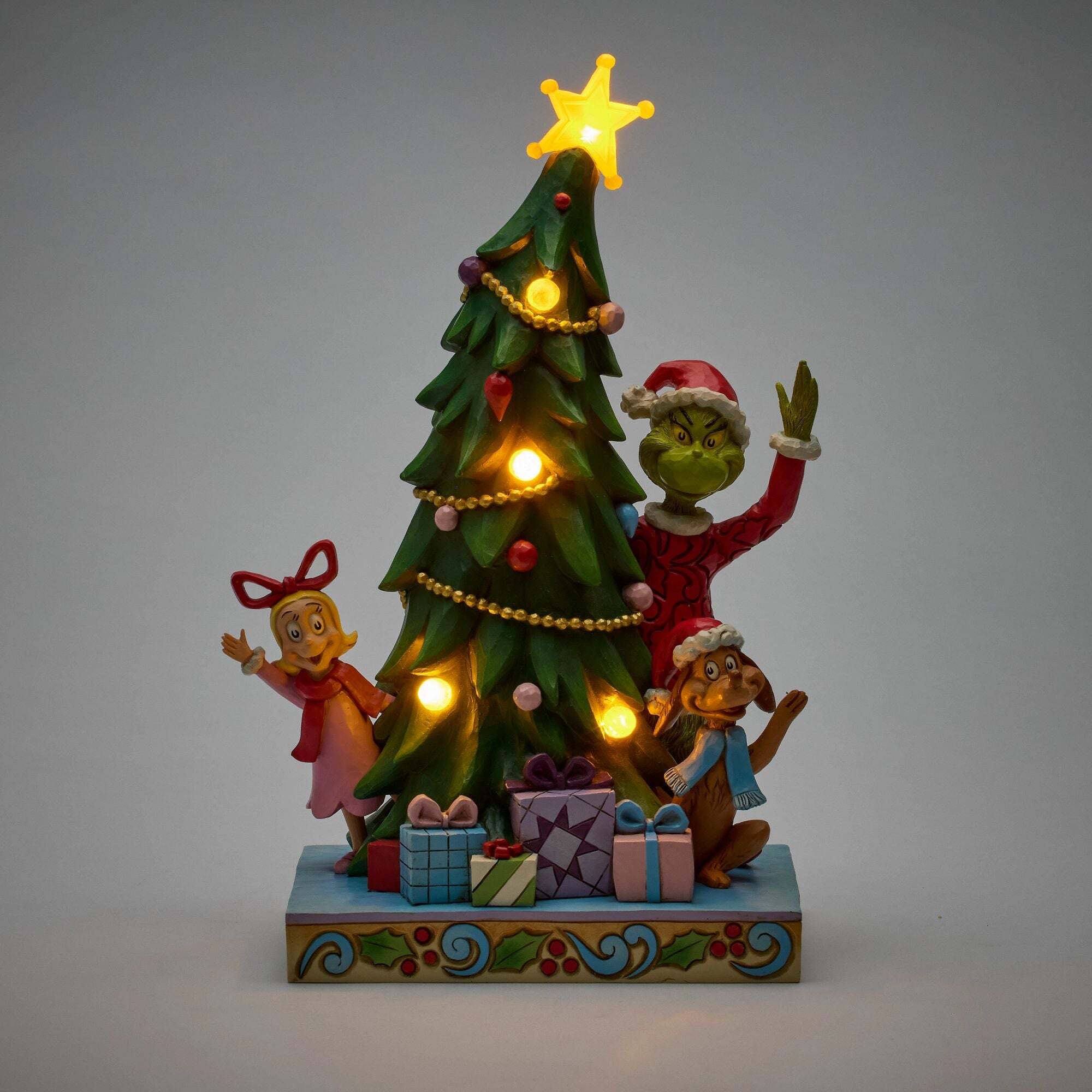 Hallo vanuit Whoville! De Grinch, Max en Cindy-Lou Who zwaaien giechel vanachter een sprankelende Kerstmis versierd met echte ledlampjes. Deze kleurrijke en met Jim Shores kenmerkende charme gemaakte figuren voegen een vleugje vrolijkheid en ondeugendheid toe aan deze kerstklassieker. Deze figuren zijn geen speelgoed voor kinderen. Uitsluitend bedoeld voor volwassenen. Hoogte: 26,5 cm