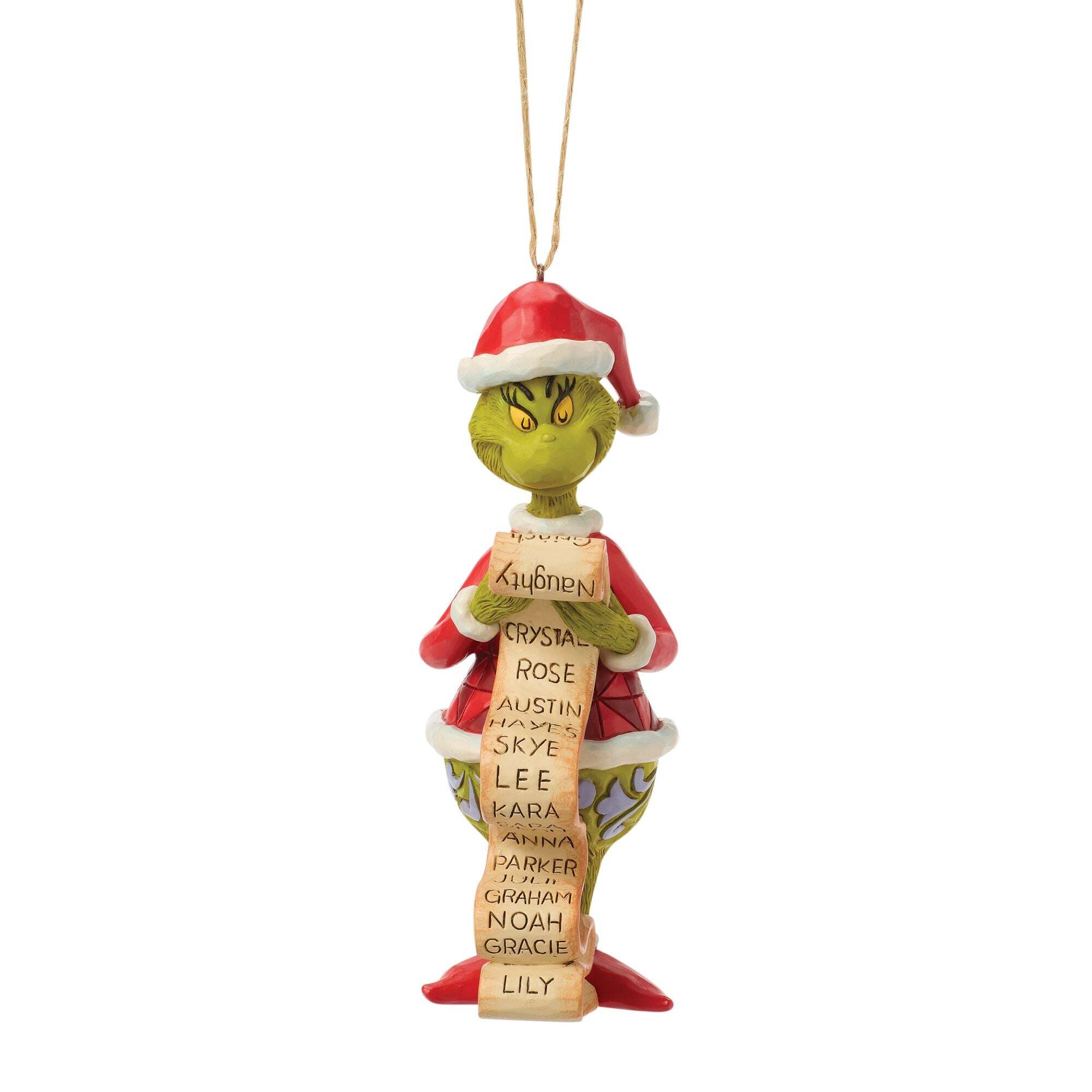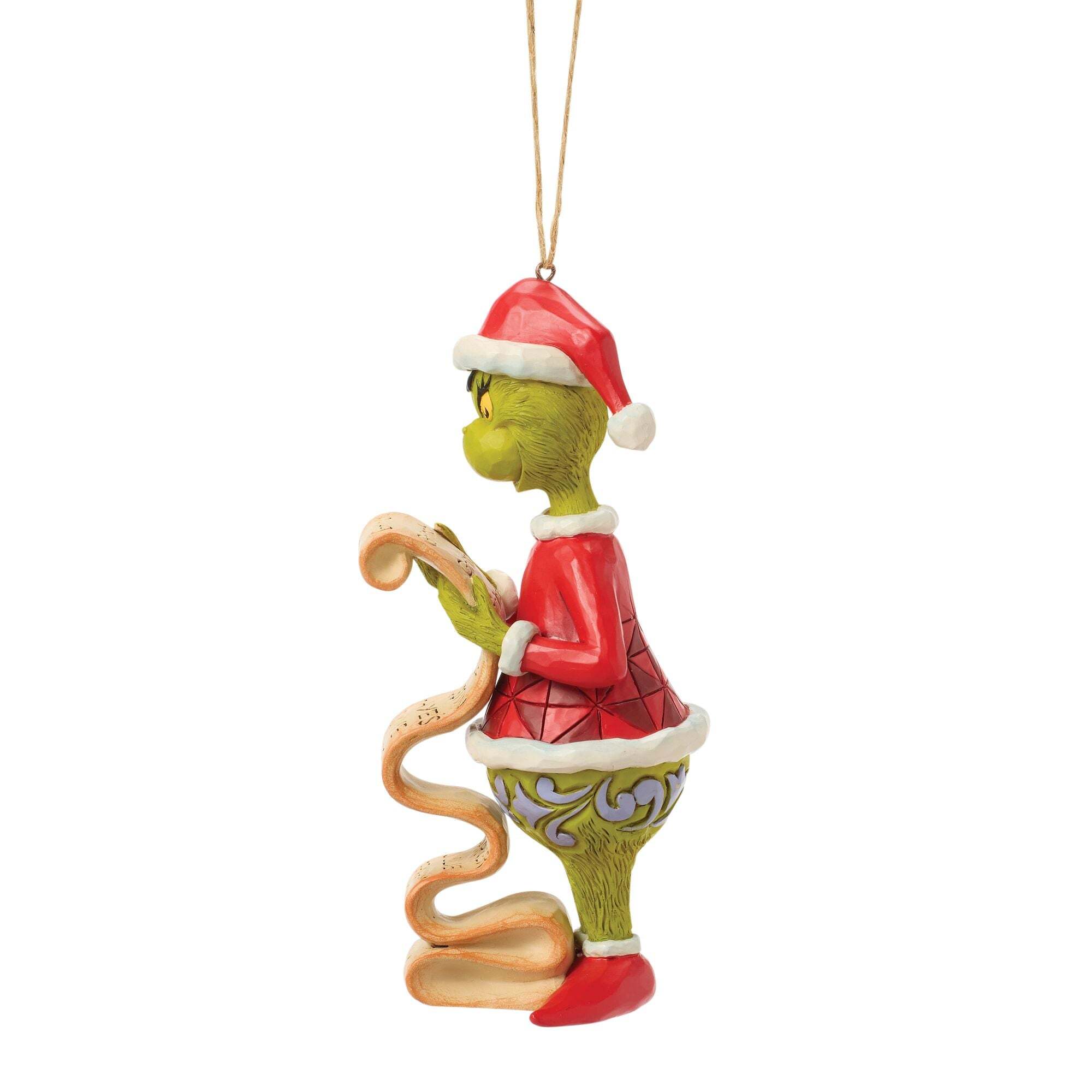 In ware Jim Shore -stijl bekijkt de Grinch zijn lange lijst met schurken en merkt trots op dat zijn eigen naam helemaal bovenaan staat. Dit speelse ornament barst van de kleurrijke patronen en feestelijke charme en legt perfect de ondeugendheid en speelsheid van dit iconische personage tijdens de feestdagen vast. Deze artikelen zijn geen speelgoed voor kinderen. Uitsluitend bedoeld voor volwassenen.