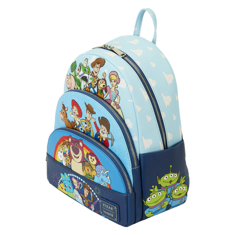 Rond je vrienden bij elkaar, het is tijd om te spelen! De Loungefly Toy Story Movie Collab Triple Pocket Mini Rugzak verenigt ons favoriete speelgoed uit de Disney-Pixar-franchise.