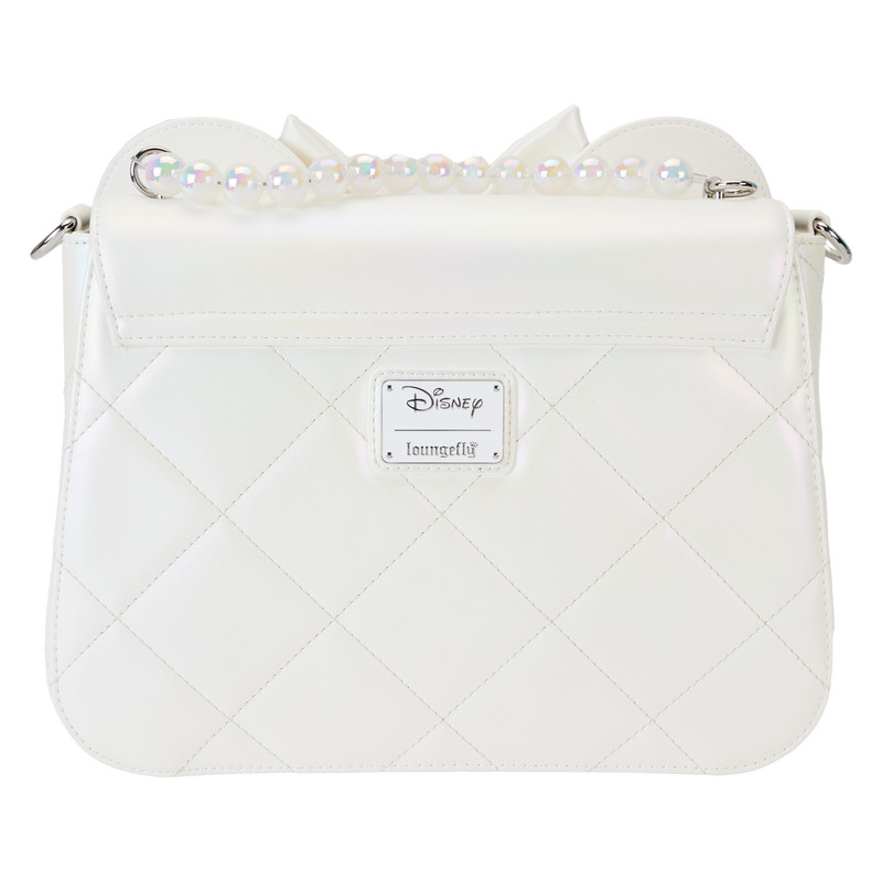 De Loungefly Disney Princess Iridescent Wedding Schoudedtas is gemaakt van veganistisch leer (polyurethaan), zilverkleurige metalen hardware, een gegoten parelhandvat en een 3D-strik met tule , verstelbare en afneembare schouderband en appliqué, gewatteerde, gegoten parel en gedrukte details. Let op de bijpassende binnenvoering.