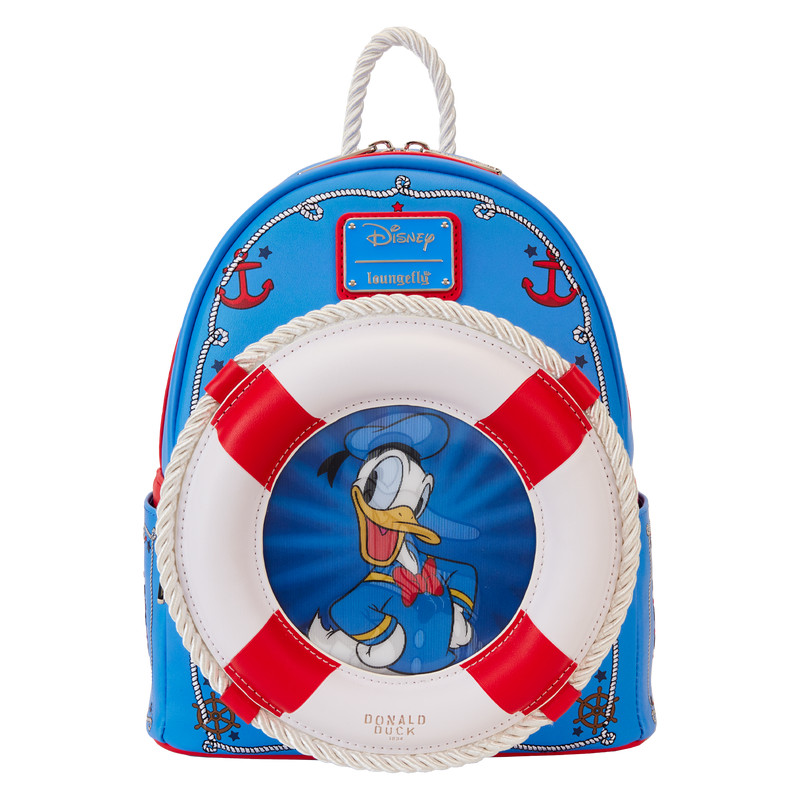 Oh jongen, oh jongen – ahoi! Vaar weg met iets leuks! Disney's Donald Eend is de ster van deze handige rugzak. De ronde zak aan de voorkant is voorzien van een reddingsring met echte touwen, en het gezicht van Donald Duck verschijnt in het midden. Lenzichtig details onthullen hem in zwart-wit, maar met een beweging van de pols verschijnt zijn gezicht in kleur. Op deze blauwe rugzak zijn ster-, anker- en nautische touwontwerpen gedrukt die kleuraccenten toevoegen in rood en donkerblauw. Origineel artwork is voortgezet op de zijkanten en achterkant van dit accessoire, met de jubileumdatum van 1934. Een handvat van echt touw zorgt voor extra gemak en maakt de look af met extra karakter. Maak indruk terwijl je het 90-jarig jubileum van Donald Duck in stijl viert.