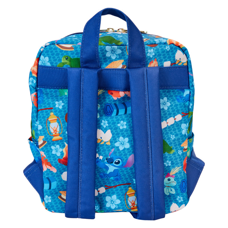 De Loungefly Stitch Camping Cuties AOP Nylon Mini Rugzak heeft gedrukte details. Tas heeft verstelbare schouderbanden en glanzende gouden hardware. Let op de coördinerende binnenvoering.