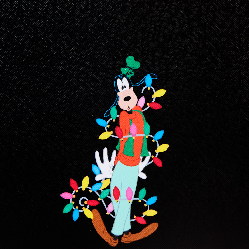 Hiep-hiep-hoera! Feestelijke lichtjes op komst! Houd alle feestverlichting bij de hand, waar u ook gaat, met onze Disney's Mickey Muis and Friends lichtgevende mini rugzak. Een elegante zwarte achtergrond laat de feestverlichting die de rand aan de voorkant omlijnt, opvallen. Mickey Muis staat bovenaan en hangt een lichtsnoer, terwijl Disney's Minnie Muis en Pluto meedoen aan het zakje eronder. In het donker lichten alle lichtjes rond de rand aan de voorkant op in verschillende kleuren! Draai de rugzak om en u ziet feestelijke prints van lichtjes en Disney's Chip & Dale, Goofy, Daisy Eend en Donald Eend. Verspreid de vrolijkheid en warmte van het seizoen in stijl met dit briljante accessoire.