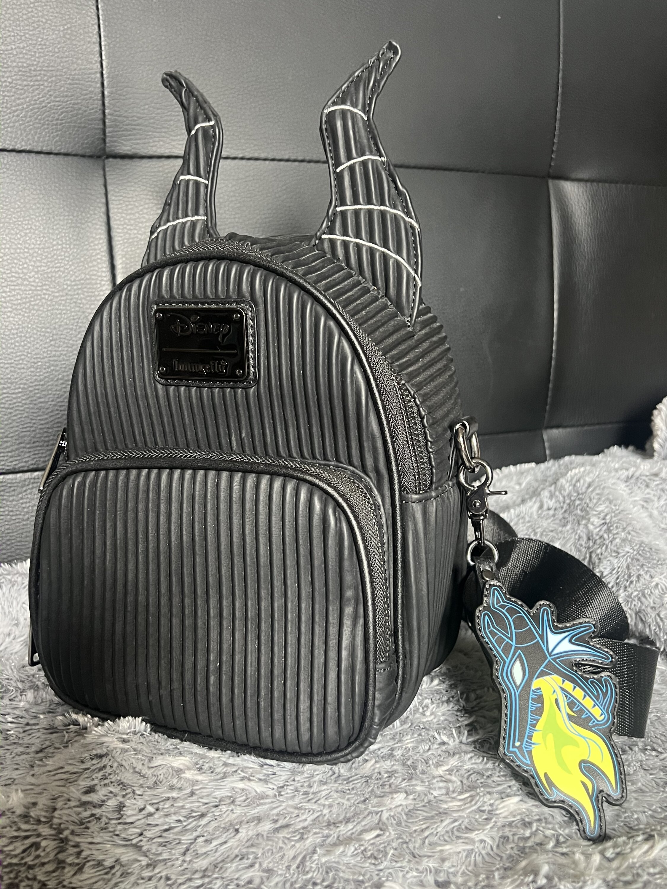 Laat de hoorns schallen! Het is tijd om het feest in stijl te verstoren. Onze Disney's Maleficent convertible rugzak is perfect om een paar cadeautjes in op te bergen. Deze elegante, geheel zwarte accessoire kan worden omgebouwd tot een schoudertas met behulp van verstelbare en afneembare banden. Corduroy, aan de voorkant en zijkanten, voegt een ondeugend prachtig textuurdetail toe. Aan de bovenkant steken de karakteristieke hoorns van Maleficent omhoog en een imitatieleren ritscharme, in de vorm van een drakenstaart, voegt een angstaanjagend leuk tintje toe. Pak je dagelijkse benodigdheden in en omarm alle leuke avonturen die je duistere hart verlangt.