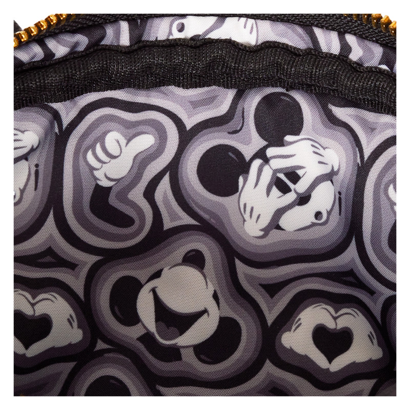Kenmerken: verstelbare en afneembare band met een print van Mickey Mouse's oren, afneembare, omkeerbare portemonnee, goudkleurige metalen hardware, bedrukte, geborduurde en geappliceerde details, bijpassende binnenvoering