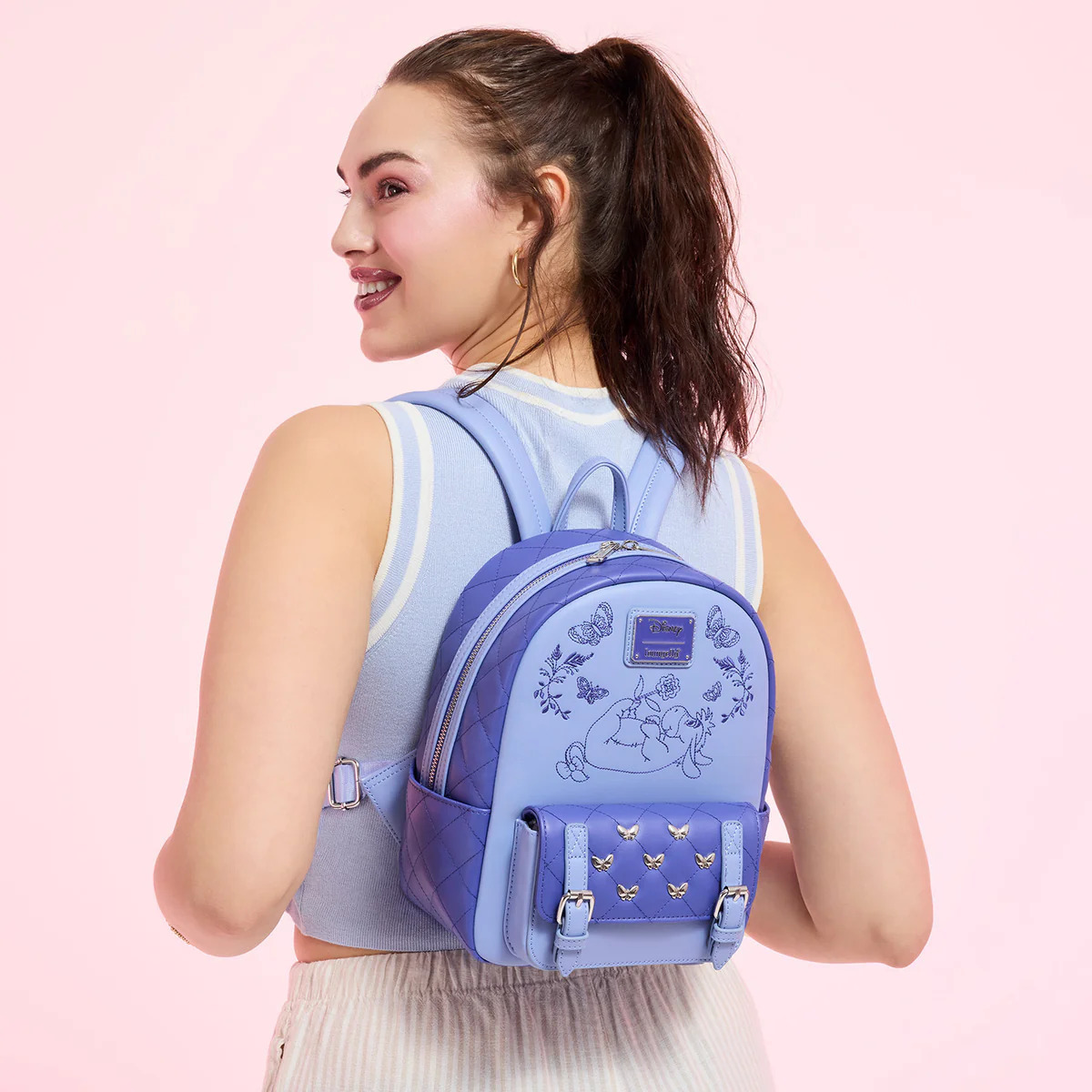 Een schattig, subtiel model dat je liefde voor Iejoor nog steeds laat zien! Iejoor is geborduurd op de voorkant, spelend met een bloem, omringd door planten en vlinders. Het voorvak heeft een gewatteerde klep met metalen bedeltjes in de vorm van vlinders voor een extra schattig detail!