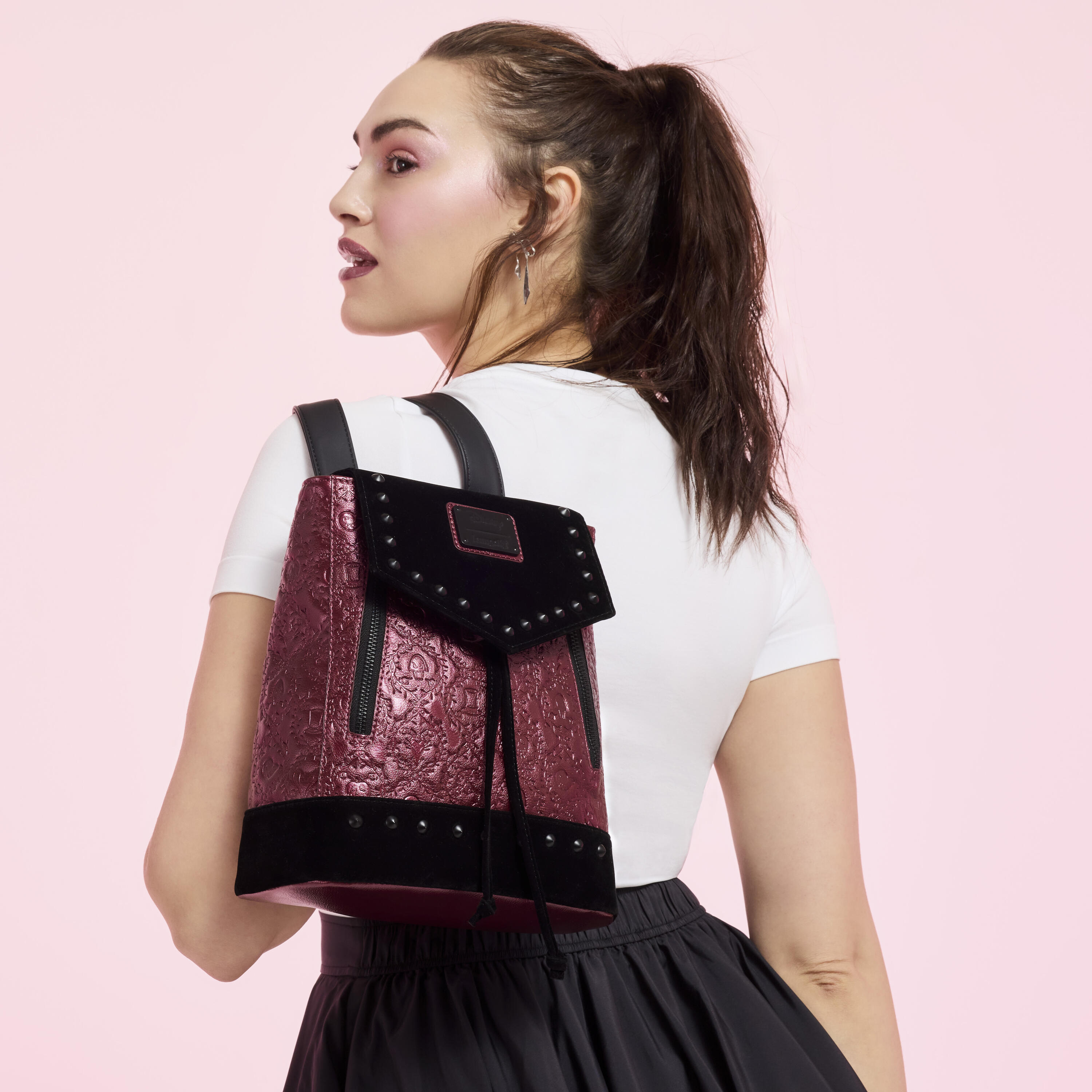 Deze mini rugzak is de perfecte accessoire om je look een stoere twist te geven! Metallic imitatieleer, fluweel en studs maken hem opvallend. Overal vind je reliëfsymbolen van je favoriete Disney-schurken, omringd door stekelige wijnranken!