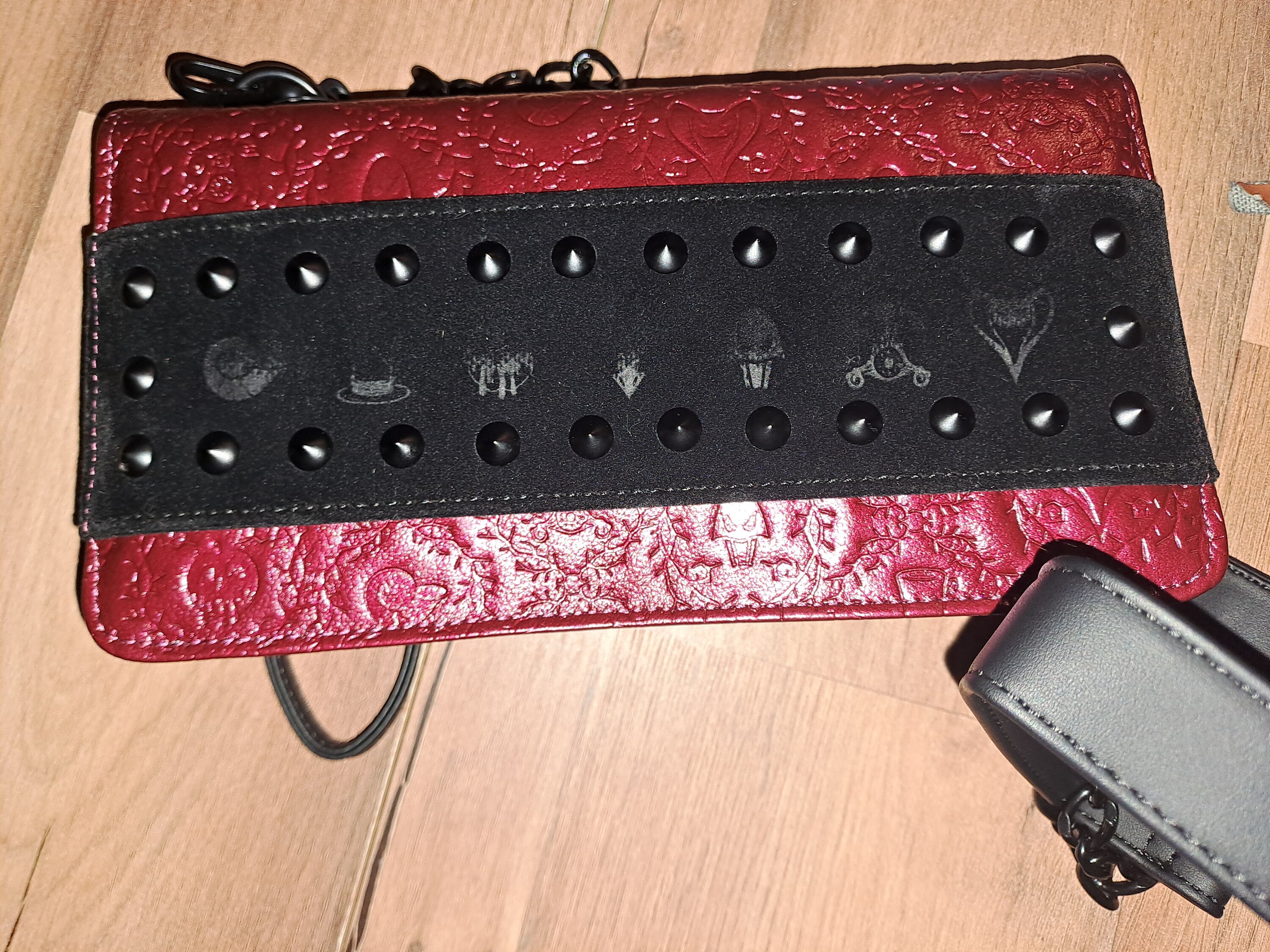 Vind reliëfsymbolen van populaire Disney-schurken in de puntige doornen over de hele tas. De studs en het fluweel maken de look compleet. Deze stijl is veelzijdig: je kunt hem als clutch dragen met het polsbandje of de crossbodyband bevestigen om hem als handtas te dragen!