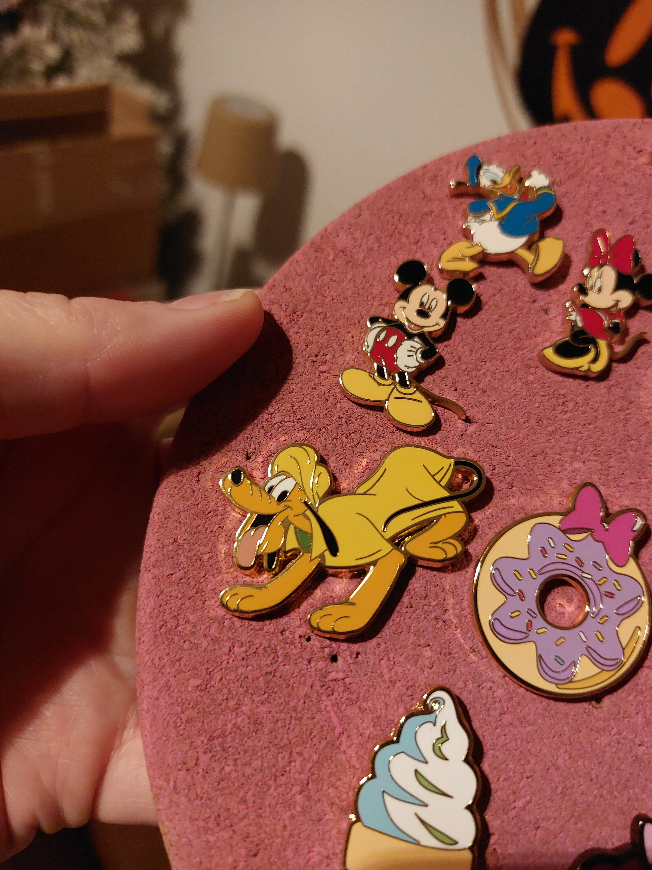 Er zijn zes mogelijke pins om te verzamelen, elk met Pluto in een andere outfit: een stijlvolle outfit, een vakantieoutfit, een regenjas, een winteroutfit en een matrozenoutfit. De speciale glitterjacht toont Pluto in een verjaardagsoutfit die wordt geknuffeld door Mickey Muis!