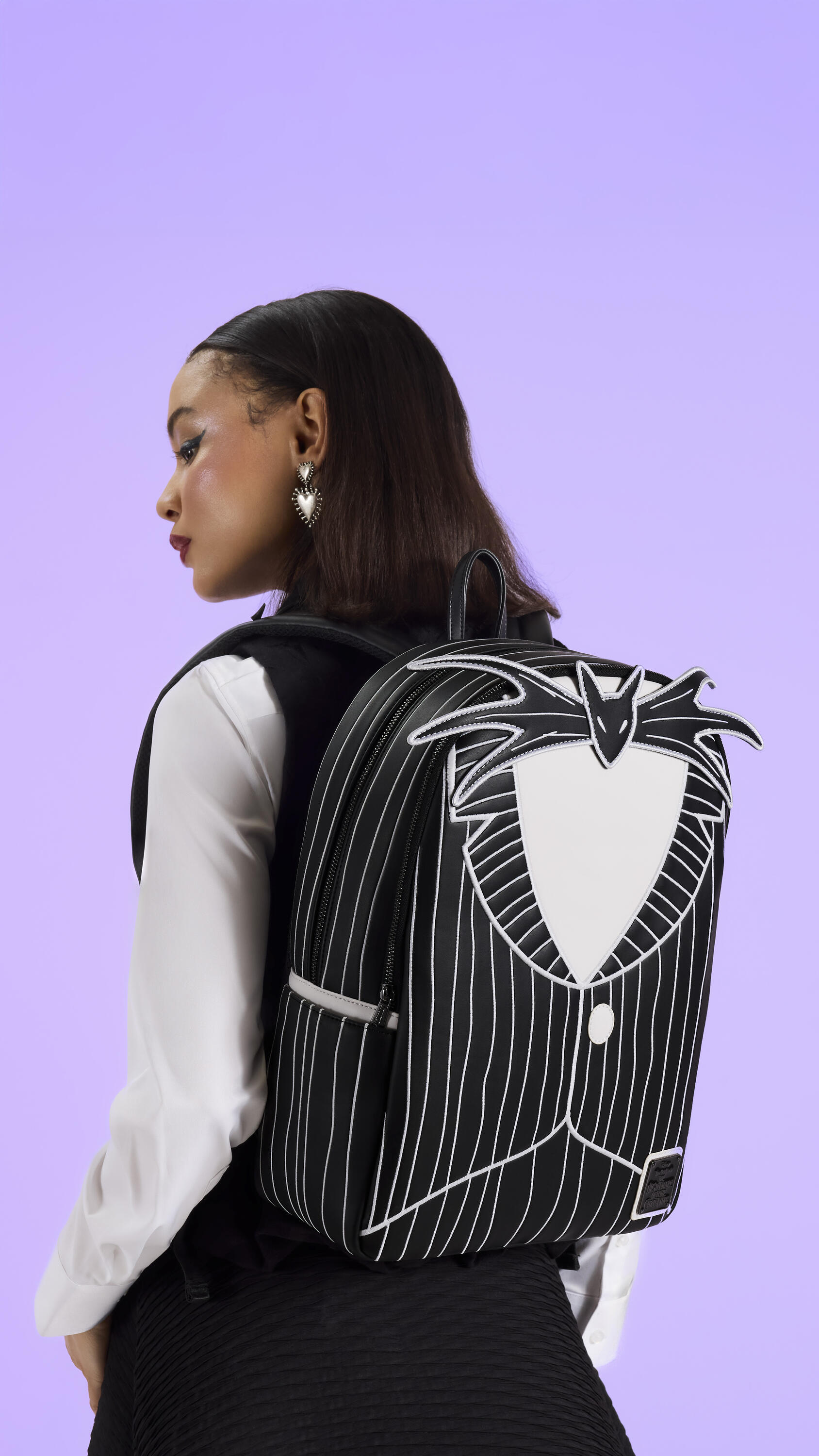 Deze imitatieleren rugzak is geïnspireerd op het pak van Jack Skellington, compleet met witte krijtstrepen en zijn klassieke vleermuisstrik. Draai de tas om en je ziet vleermuizen op de banden en een geborduurde afbeelding van Jacks gezicht op de achterkant. En voor extra griezelplezier: deze tas licht op in het donker!