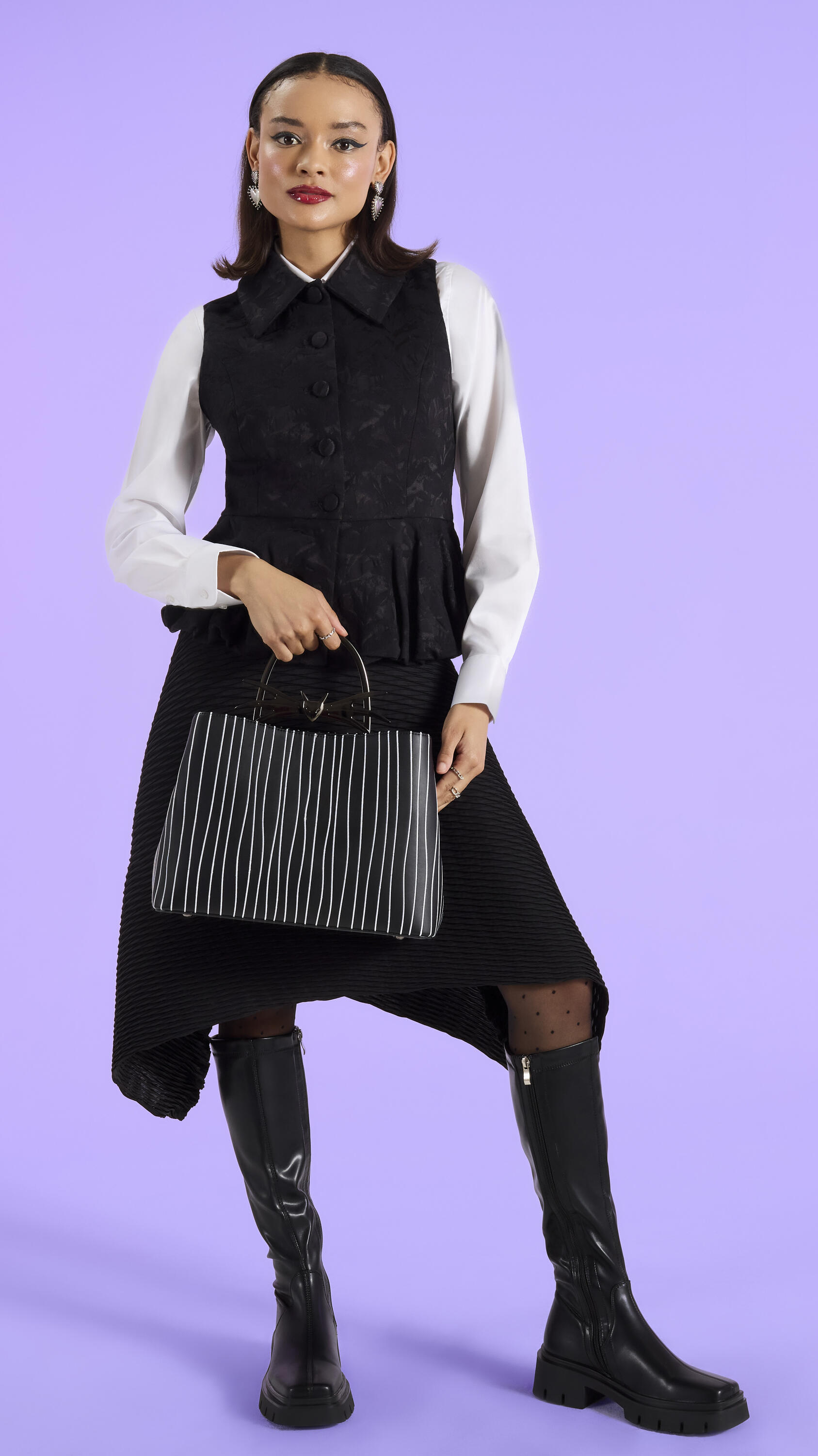 Deze handbag is geïnspireerd op Jack Skellingtons pak, compleet met geborduurde details van Jacks krijtstreeppak. Een metalen handvat steekt bovenaan uit en is voorzien van een vlinderdas in de vorm van een metalen vleermuis. Hij licht ook op in het donker!