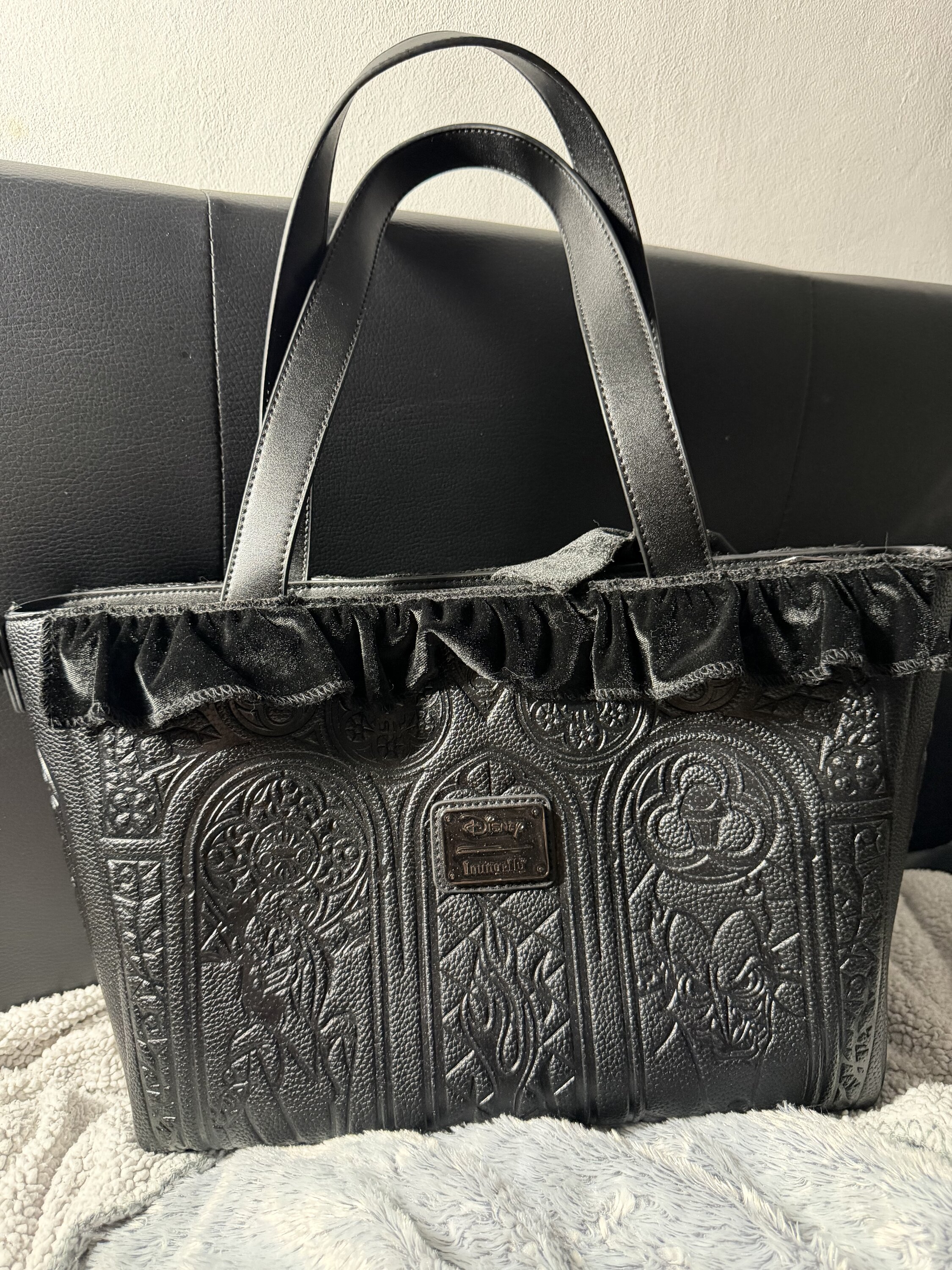Deze shopper is de Disney Schurken mode waar je naar op zoek was. Deze tas heeft een fluwelen ruche aan de bovenkant. Daaronder vind je glas-in-loodramen met 3D-borduurwerk van je favoriete Disney Schurken. Metallic imitatieleer en een fluwelen strik maken de look compleet.