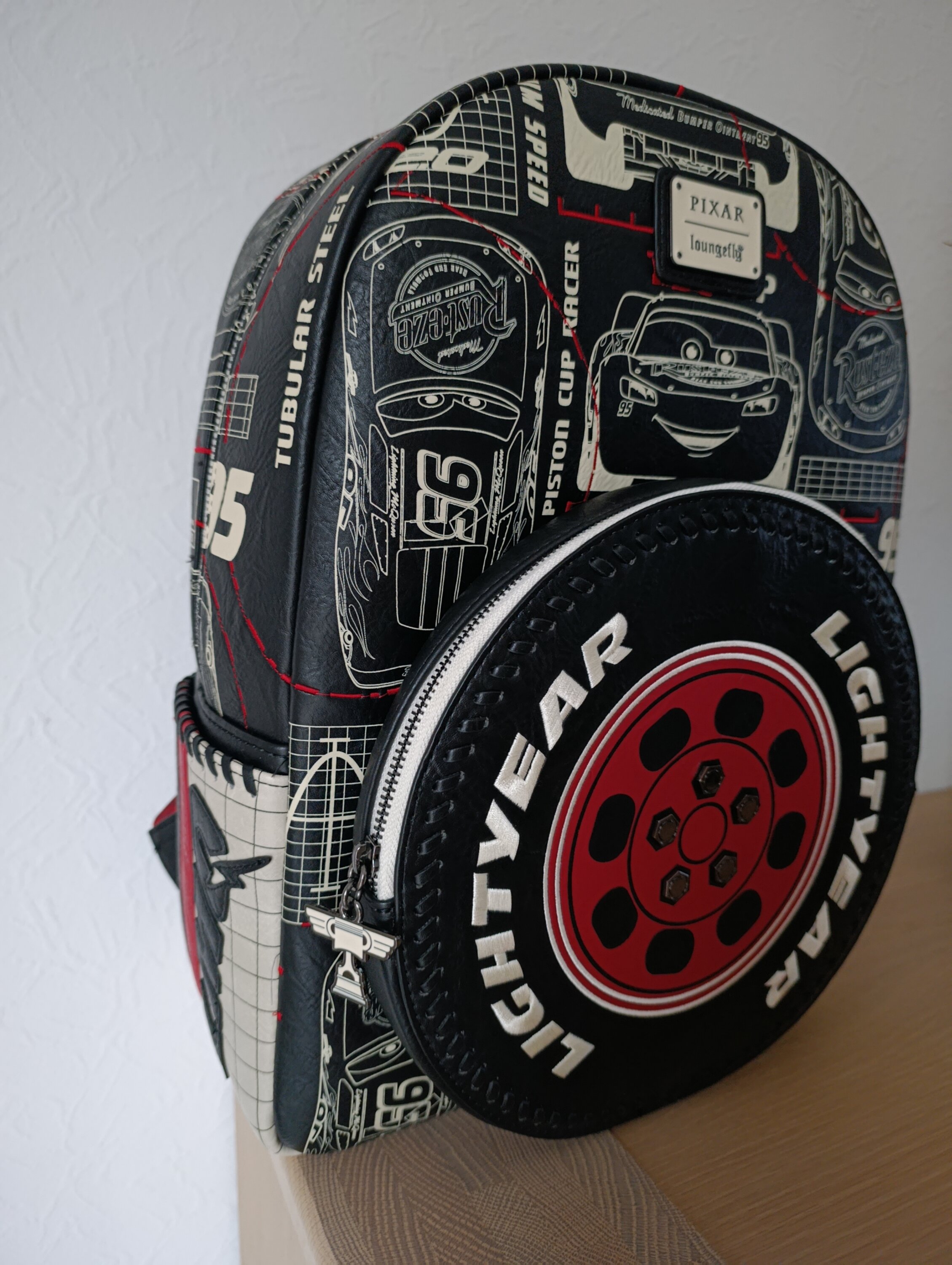 Deze full-size rugzak is voorzien van verschillende afbeeldingen van Cars personages in het wit tegen een zwarte achtergrond. Het voorvak heeft de vorm van een autoband met de tekst "Lightyear" aan de zijkant en in het midden zitten gegoten metalen klinknagels! De banden zijn half wit, half rood en voorzien van een applicatie van het nummer "95".