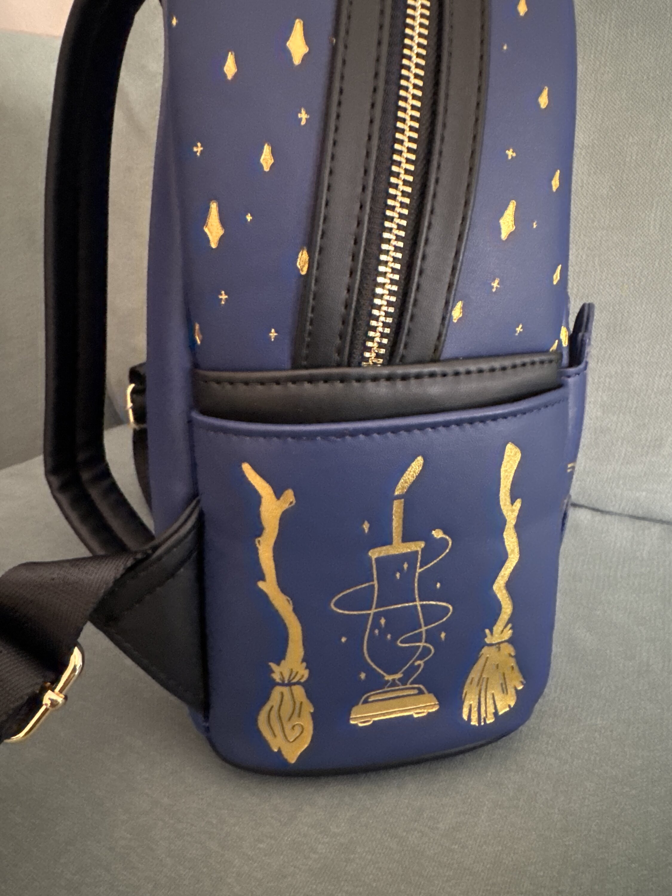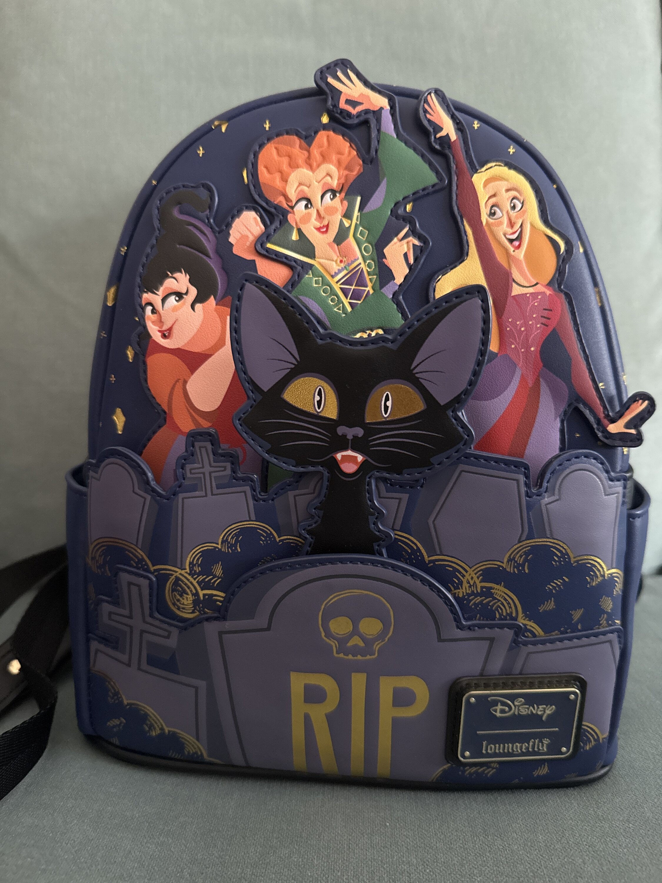 Deze mini rugzak toont de Sanderson zussen uit Disney's Hocus Pocus. Ze dansen samen onder een sterrenhemel op een kerkhof. Binx duikt op vanachter een grafsteen! Op de zijzakken vind je gouden details van elk van hun bezems.