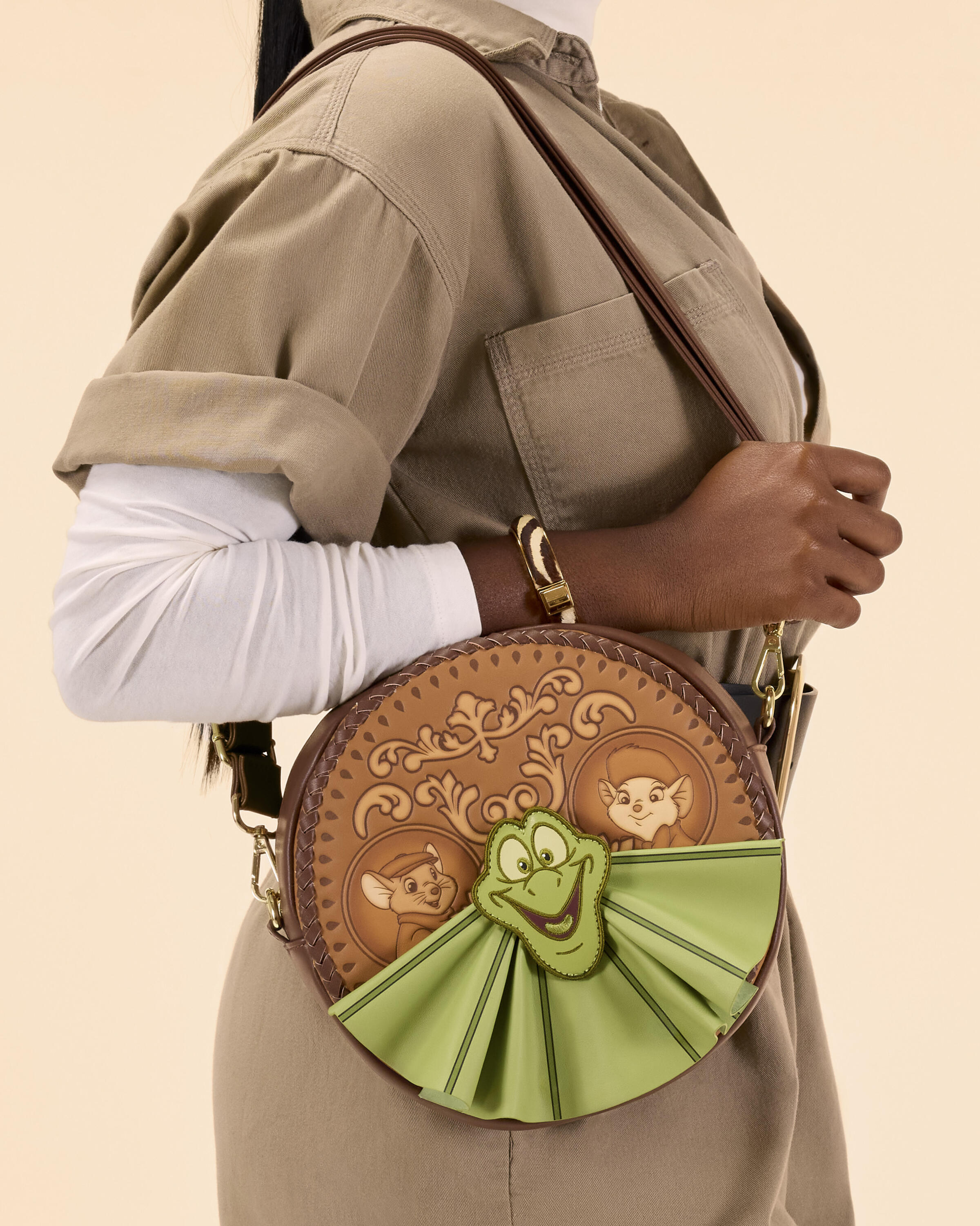 Deze crossbodytas heeft de vorm van een cirkel en heeft Frank op de voorkant. Achter hem vind je reliëfprints van Bernard en Miss Bianca. Franks kraag loopt uit en bedekt de voorkant van de tas. Draai de tas om en ontdek meer reliëfdetails, waaronder het silhouet van een albatros.