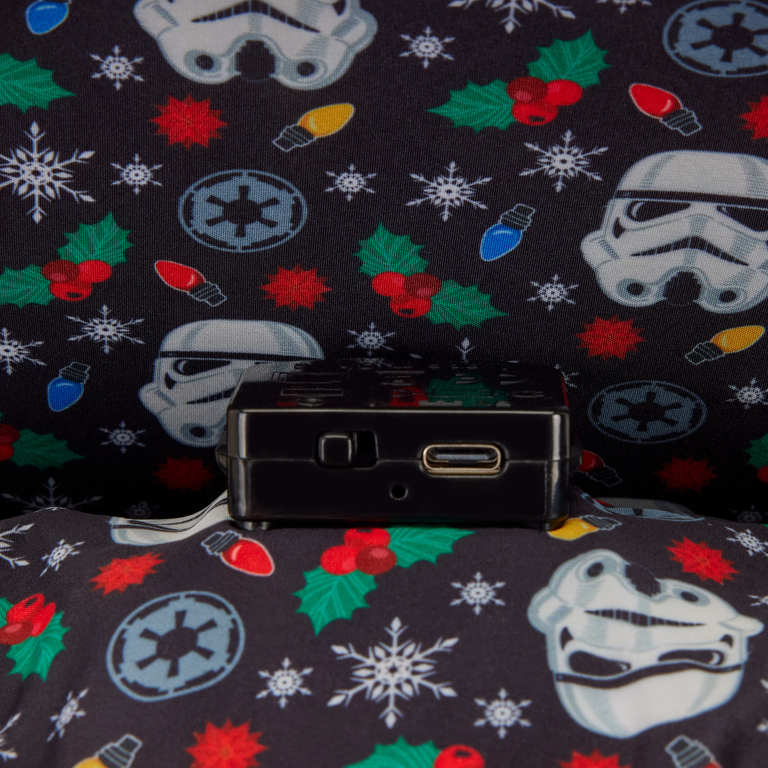Deze STAR WARS™ mini rugzak is klaar voor een feestje! In het midden van de tas vind je een Stormtrooper-helm, omringd door geborduurde feestlampjes. Sommige lampjes geven zelfs licht ! Gelakt imitatieleer geeft de tas extra glans voor de feestdagen. Je vindt meer seizoensontwerpen op het zijvak en applicatiesneeuwvlokken op de bandjes!