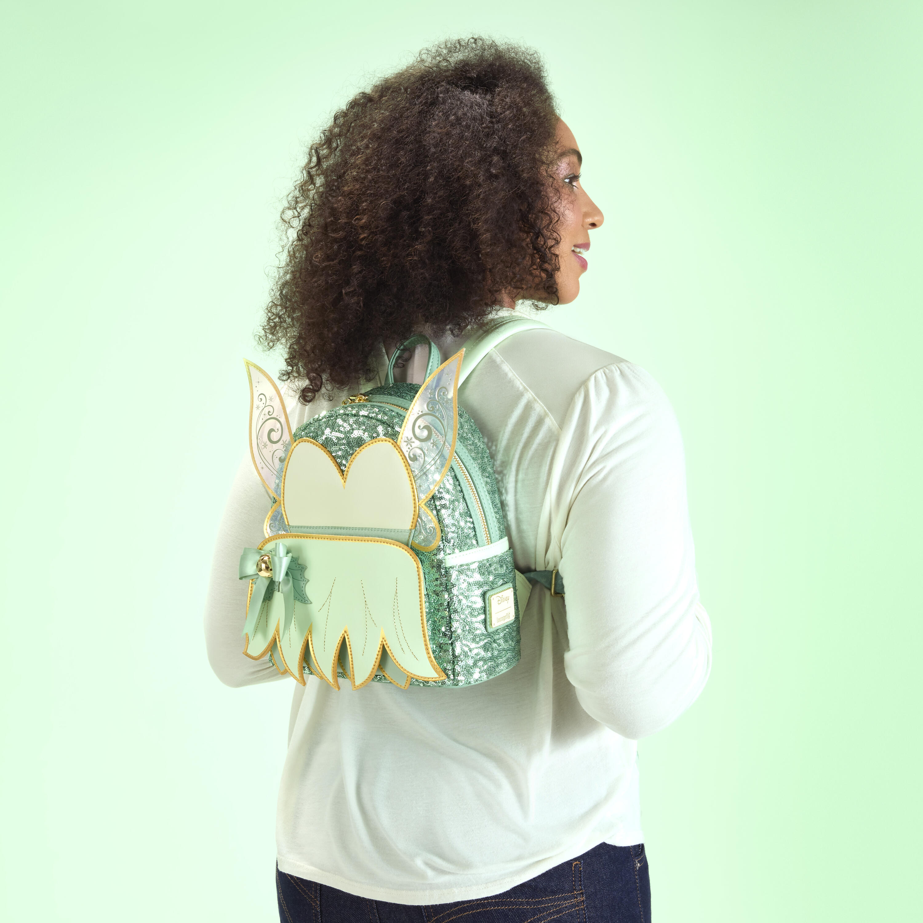 Deze mini rugzak met pailletten heeft de jurk van Disney's Tinker Bell op de voorkant. Je vindt er prachtige details zoals gouden randverf, een satijnen strik en een echte bel! PVC-vleugels lopen over de zijkanten van de tas met reliëfdetails.