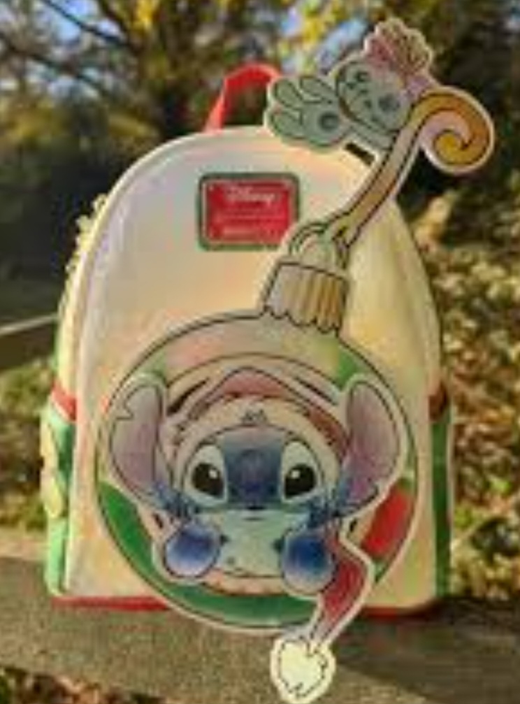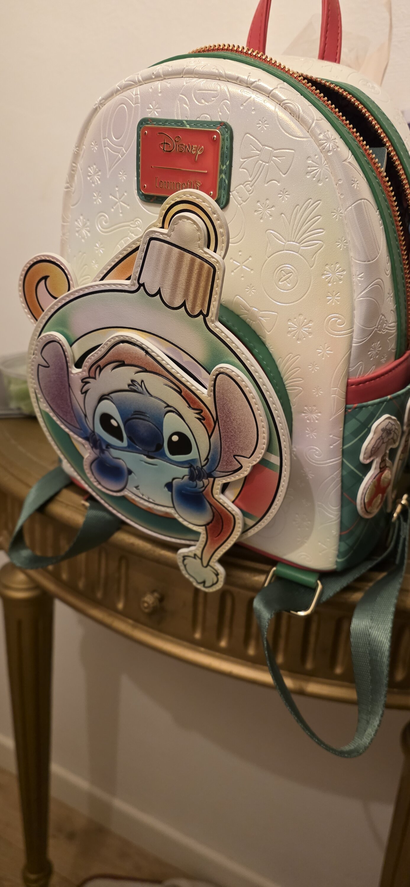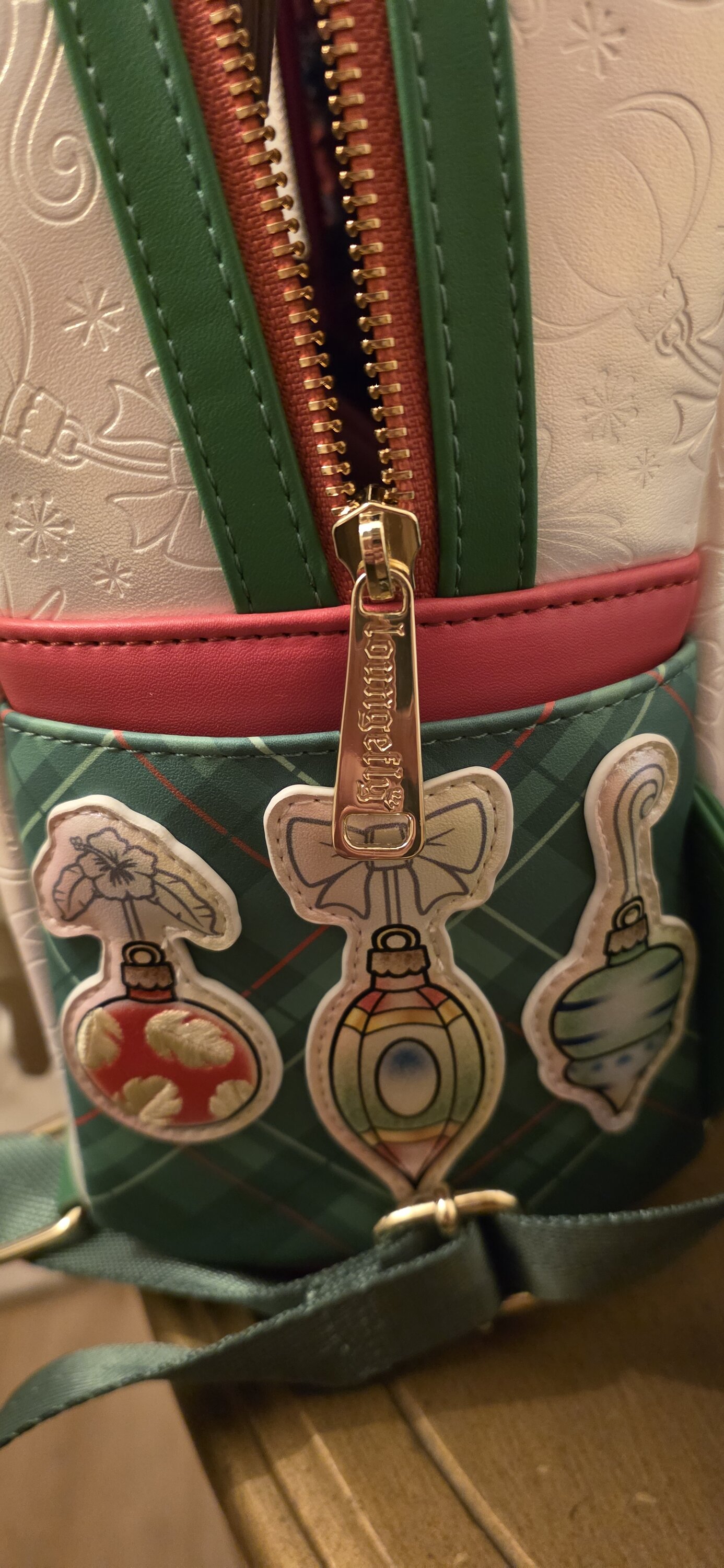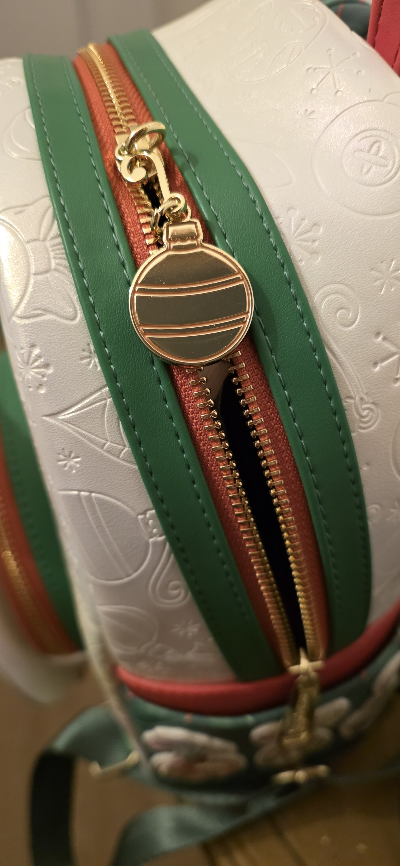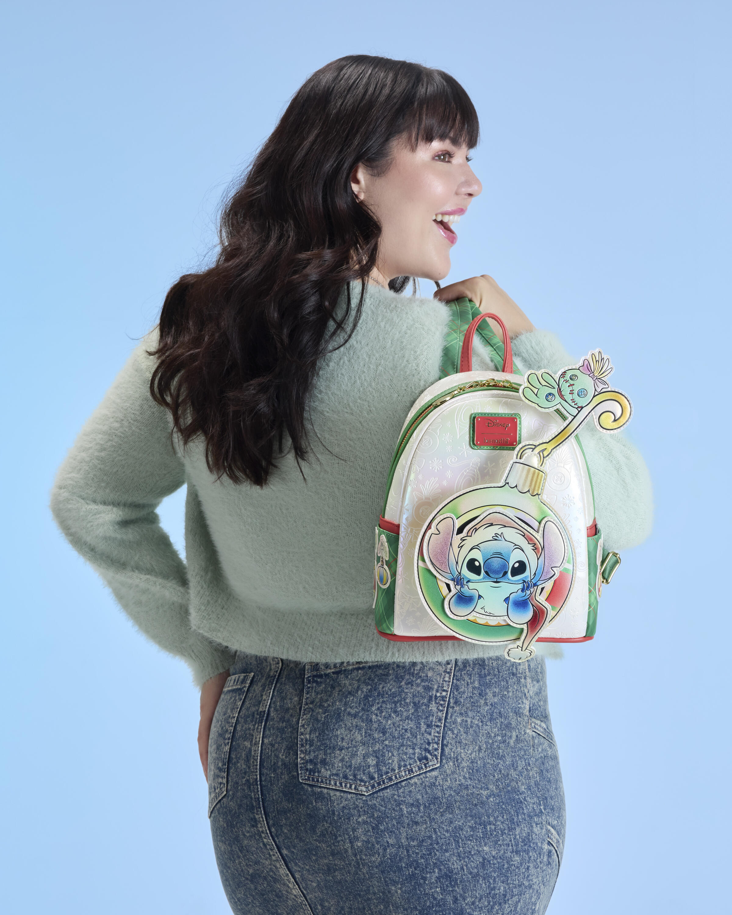 Deze mini rugzak is klaar om de feestdagen te vieren! Je ziet Stitch onder een ornament boven het voorvakje uitsteken. Scrump hangt aan de haak van het ornament en kan heen en weer bewegen! Over de rest van de tas vind je overal ornamenten op een parelmoeren achtergrond. De geruite bandjes maken de look helemaal af!