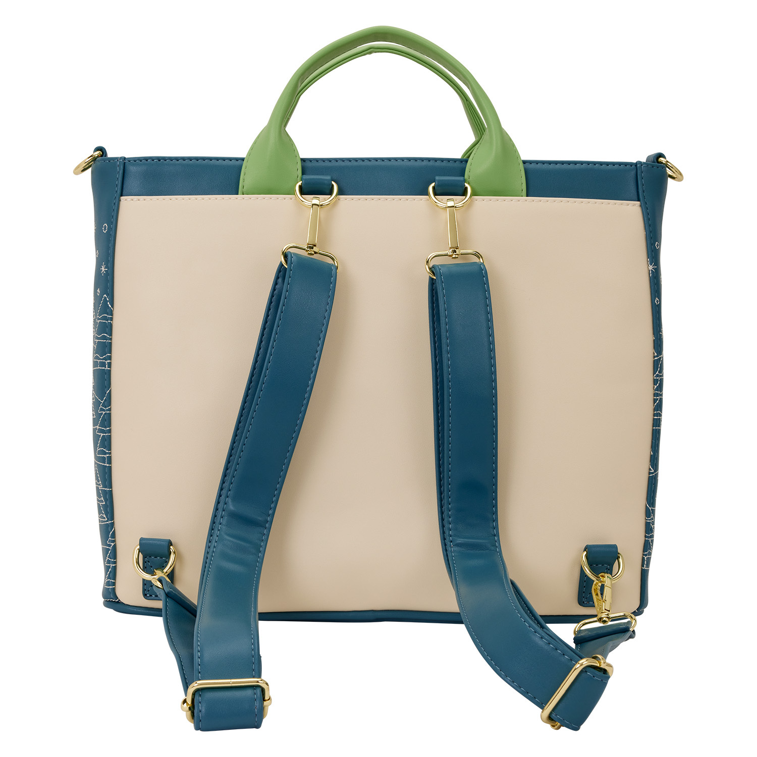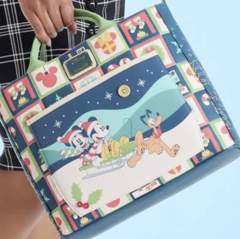 Deze omvormbare shopper kan worden gebruikt als tas en rugzak. Hij heeft een afbeelding van Mickey Muis en Minnie Muis die met Pluto op een heuvel sleeën. Het heeft ook een gewatteerd reliëfpatroon met kousen boven het vuur, een ornament in de vorm van Mickey, een cadeautje in de vorm van Minnie, kransen en meer! De quilt aan de zijkanten toont groenblijvende bomen!