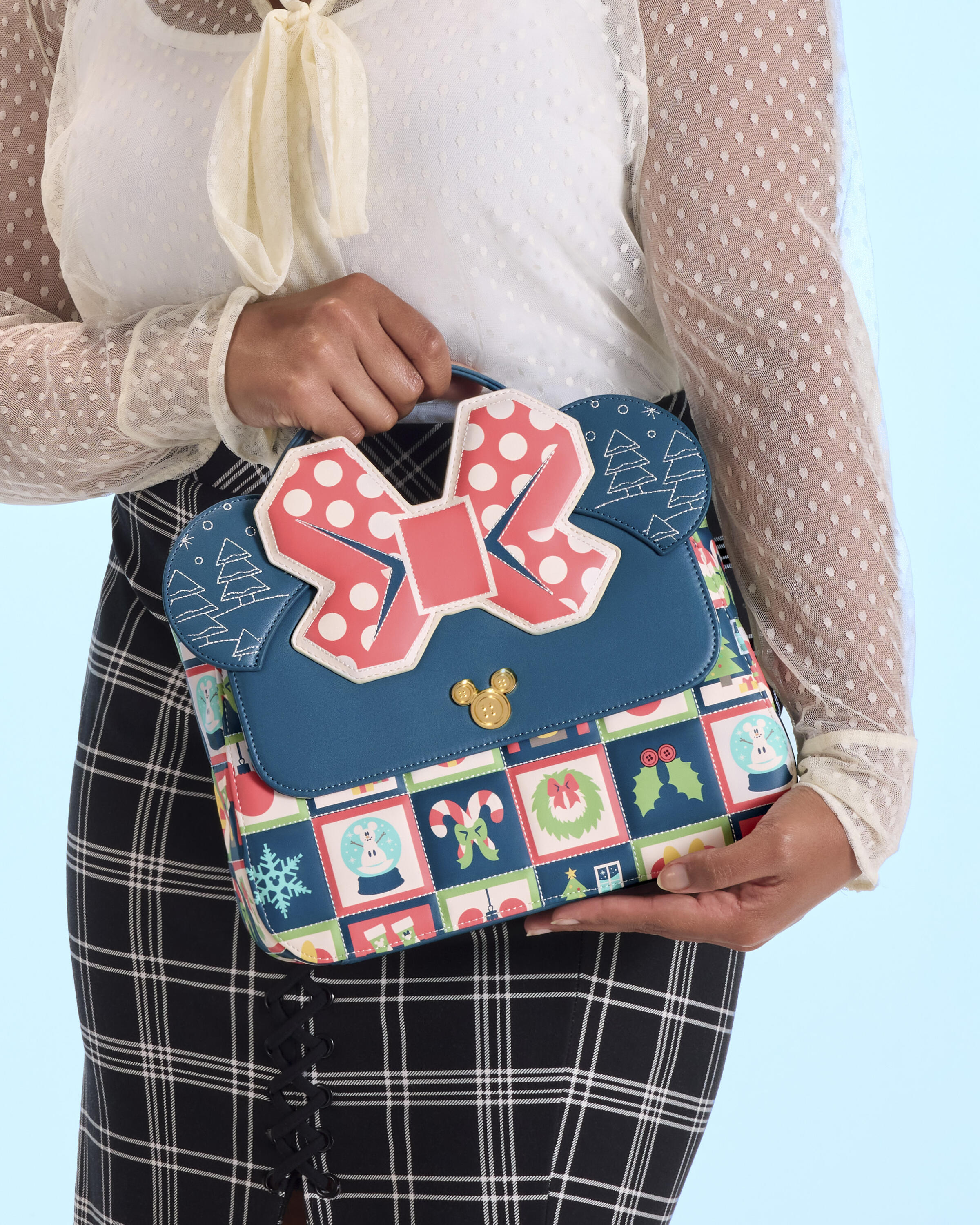 Deze schoudertas is geïnspireerd op Disney's Minnie Muis! Je vindt er een all-over patroon met gewatteerde reliëfstrepen van sneeuwbollen, zuurstokken, kransen, sneeuwvlokken en meer. Op de voorklep vind je een gegoten metalen klinknagel met het silhouet van Mickey Mouse. Bovenop vind je ook applicatie-oren en de strik van Minnie Mouse!