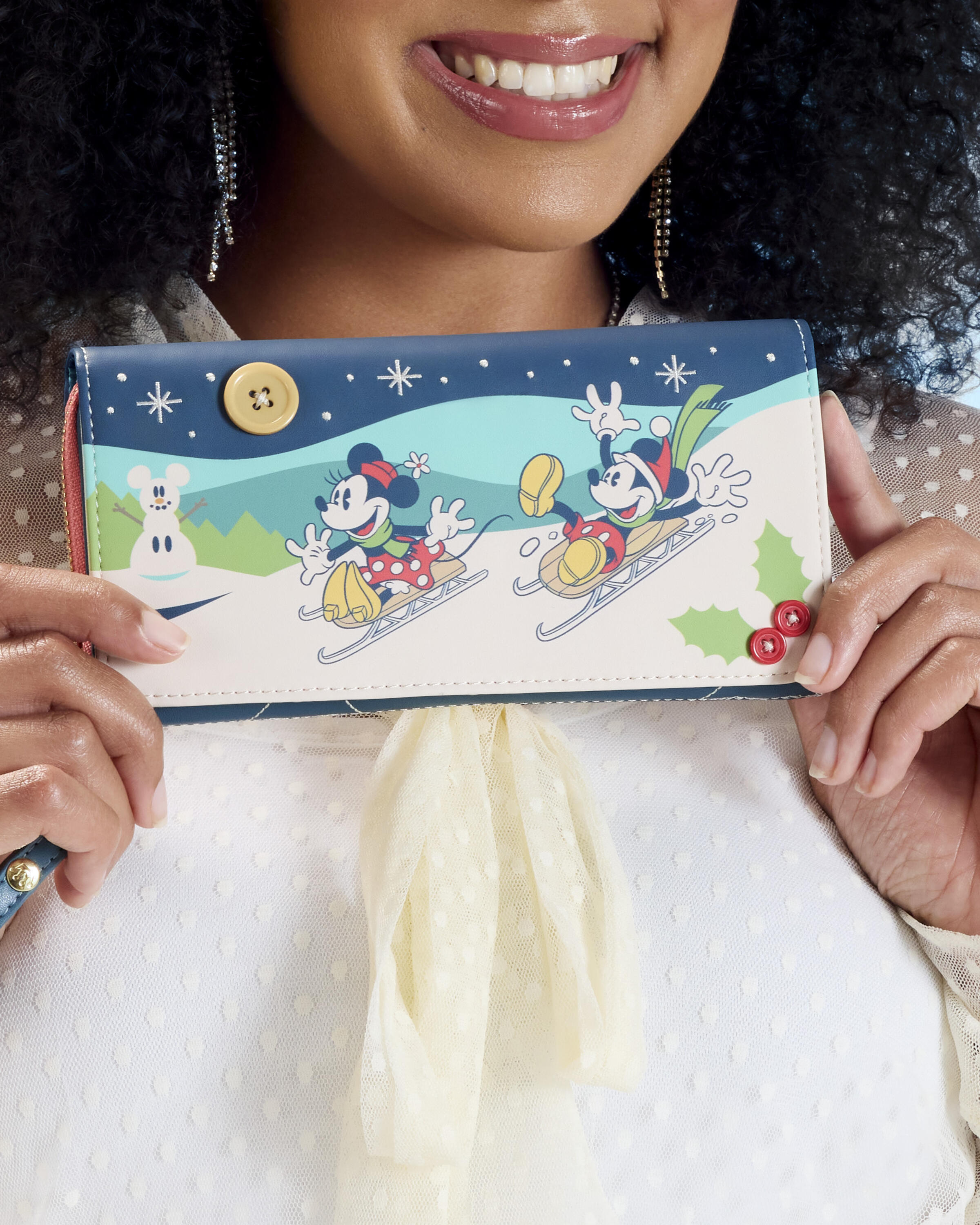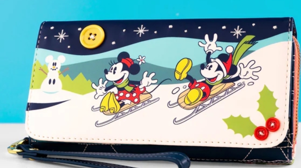 Deze polsband portemonnee toont Mickey en Minnie die van een heuvel af sleeën. Op de achterkant vind je een gewatteerd, reliëfontwerp met verschillende feestsymbolen zoals kransen, cadeaus, sneeuwvlokken en meer! Binnenin zitten zes kaartvakken en één transparant ID-vak. Bovendien is er een afneembaar polsbandje, zodat je hem kunt dragen zoals je wilt!