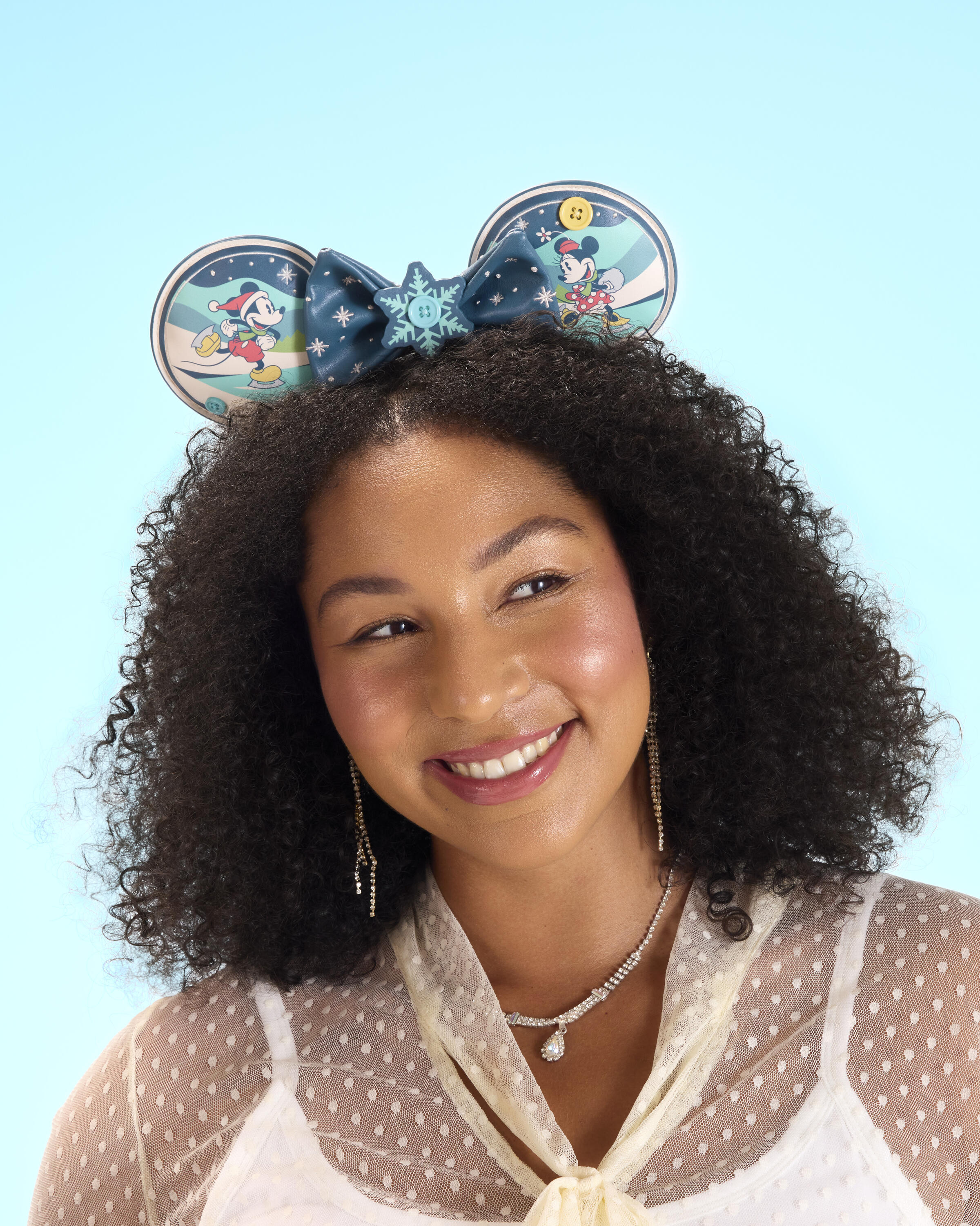 Deze haarband is voorzien van schaatsende Mickey en Minnie. Tussen de oren zit een afneembare strik met een sneeuwvlokje in het midden en sterren op de strik. Draai hem om en je ziet een gewatteerd patroon aan de achterkant van de oren met groenblijvende bomen.