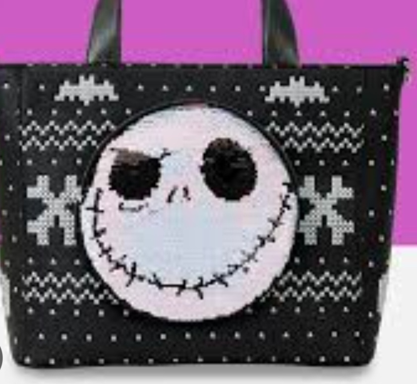 Deze tote bag is geïnspireerd op een feestelijke trui. Je vindt vleermuizen, zigzagpatronen en de tekst ""Pumpkin King"" op de achterkant. Op de voorkant staat het gezicht van Jack Skellington, gemaakt van pailletten. De pailletten zijn omkeerbaar, dus de afbeelding kan worden omgewisseld voor een pompoen! Het muntenzakje dat aan de schouderband vastzit, past bij het artwork van Jack op de tas en kan ook worden verwisseld tussen hem en een pompoen!