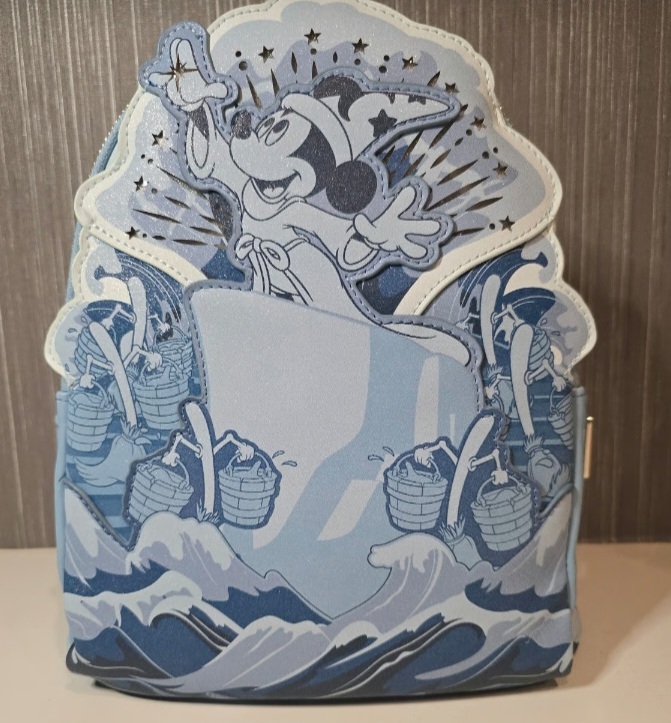 Deze mini rugzak is geïnspireerd op Disney's Fantasia. Je ziet tovenaar Mickey op de voorgrond terwijl hij magie gebruikt (de sterren om hem heen lichten op!). Om hem heen kletteren golven en de magische bezems! Goudfolie en glanzend imitatieleer maken dit een extra speciaal item.