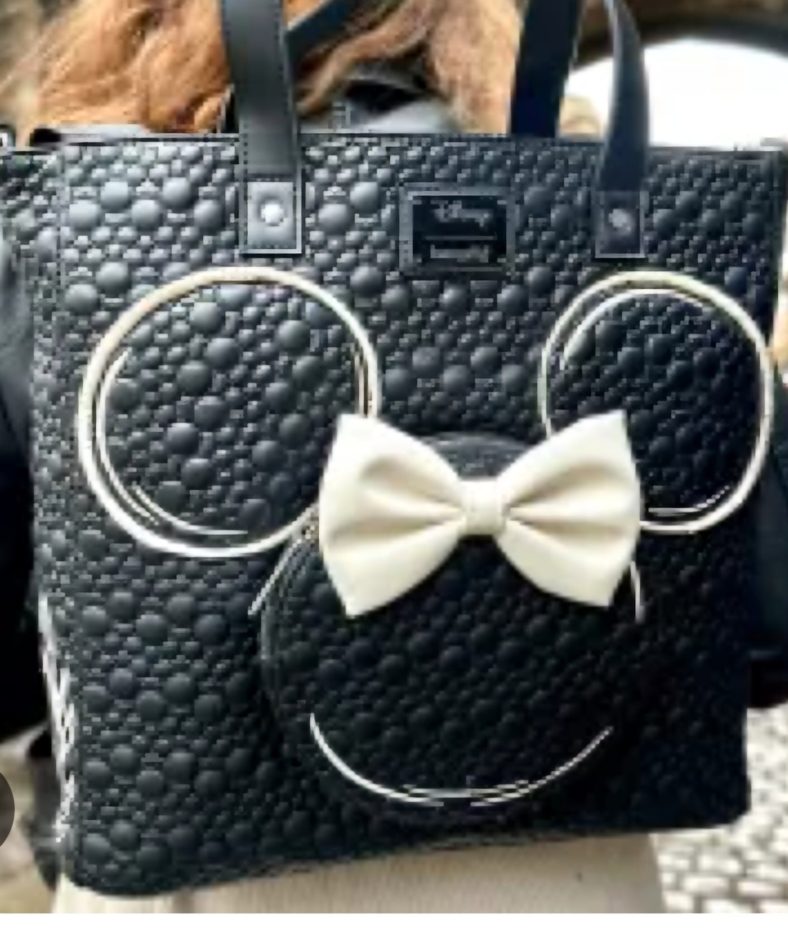 Deze tas is te gebruiken als rugzak en als shopper. Overal vind je een gewatteerd patroon met Mickey Muis silhouetten. Het voorvak lijkt op het silhouet van Minnie Mouse, "geschetst" op de tas. Hij heeft een 3D-strik! Aan de zijkant vind je geborduurde bloemen en bladeren.